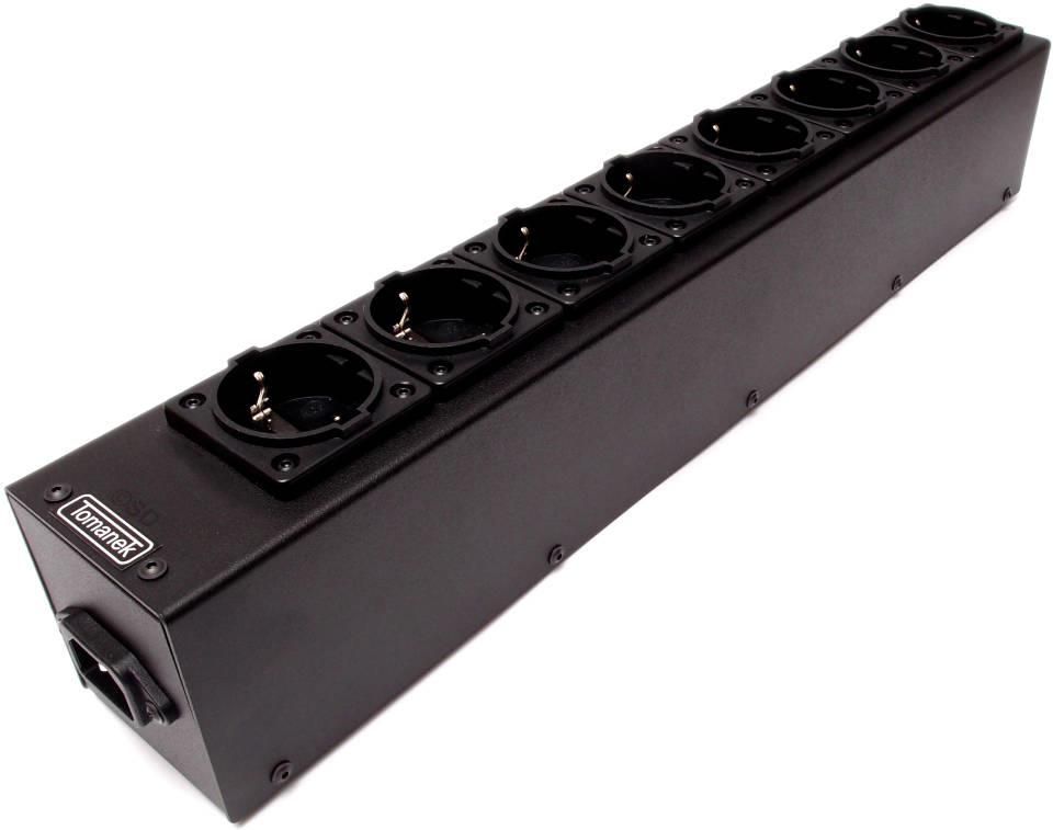 TOMANEK AUDIO POWER model TAP8S. Listwa zasilająca 8-gniazdowa jednorzędowa do sprzętu audio. Listwa zasilająca wyposażona w 8 gniazd typu Schuko oraz gniazdo wejściowe typu IEC. Ochrona przeciwzakłóceniowa urządzeń, zasilanych za pośrednictwem TAP8S, zrealizowana jest w postaci ośmiu niezależnych filtrów Schaffnera, które separują każde z urządzeń od źródła zasilania i od siebie nawzajem. Takie połączenie daje bardzo dużą skuteczność tłumienia zakłóceń oraz pozwala na duże obciążenie prądowe listwy (5 A na każde gniazdo, nie więcej jednak niż 16 A w sumie dla wszystkich gniazd). Listwą możemy zatem zasilać urządzenia o dużym poborze prądu, np. wzmacniacze mocy, jak również wszystkie inne wchodzące w skład systemu audio. Budowa: Szkieletem listwy jest obudowa wykonana z stali pomalowana proszkowo. Obudowa o wymiarach 70 x 90 x 460 mm. Konstrukcja taka zapewnia listwie bardzo dużą wytrzymałość mechaniczną oraz odporność na zakłócenia elektromagnetyczne. Filtry Schaffnera umieszczone są na wspólnej płytce wewnątrz obudowy. Listwę dostarczamy bez przewodu zasilającego. Zachęcamy do skorzystania z oferty naszych profesjonalnych przewodów serii Audio Power TPC, Power TPC lub standardowych przewodów zasilających.