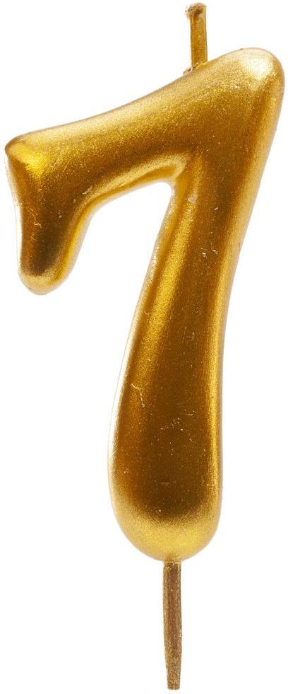 Metaliczna świeczka cyferka siedem 7 w kolorze złotym. Idealna dekoracja tortu na urodziny i nie tylko. Wymiary: wys. 5,5 cm (świeczka bez patyczka). Opakowanie: 1 szt.