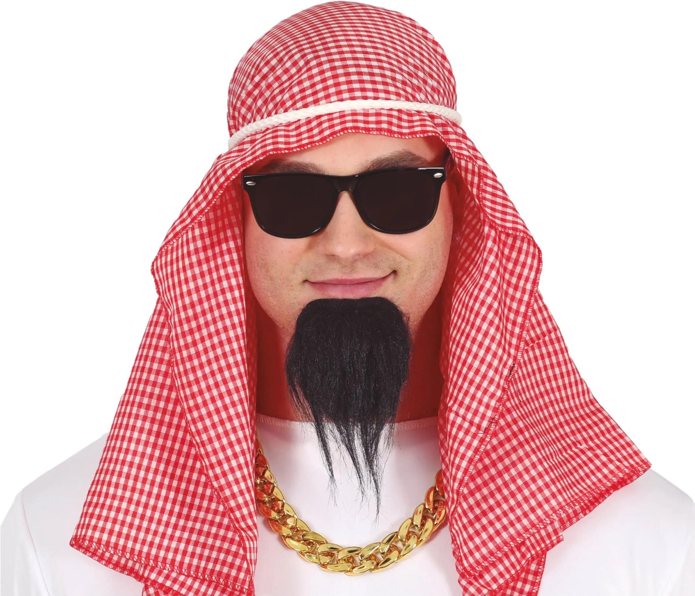 Zestaw Arab Szejka Turban Okulary Broda Zestaw Arab Szejka Turban Okulary Broda Zestaw zawiera: chustę, okulary, brodę. Chusta w czerwono-białą kratkę. Dodatkowo biały sznurek mocujący chustę na głowie. Okulary z ciemnymi szkłami w czarnej oprawce. Sztuczna broda w kolorze czarnym. Sprawdzi się jako dodatek do stroju lub pojedynczy gadżet.