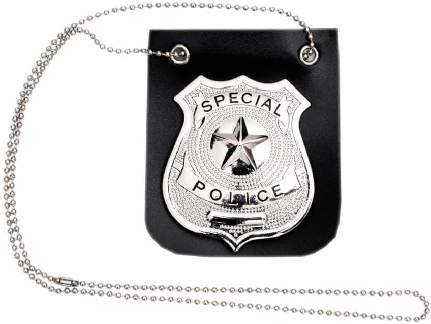 ODZNAKA POLICJANTA NA ŁAŃCUSZKU Odznaka policjanta z łańcuszkiem do noszenia na szyi, ze skóropodobną podkładką to świetny gadżet idealnie pasujący do przebrania policjanta. Baź niczym amerykański stróż prawa. Oryginalny gadżet dla dzieci i dorosłych rozmiar: uniwersalny