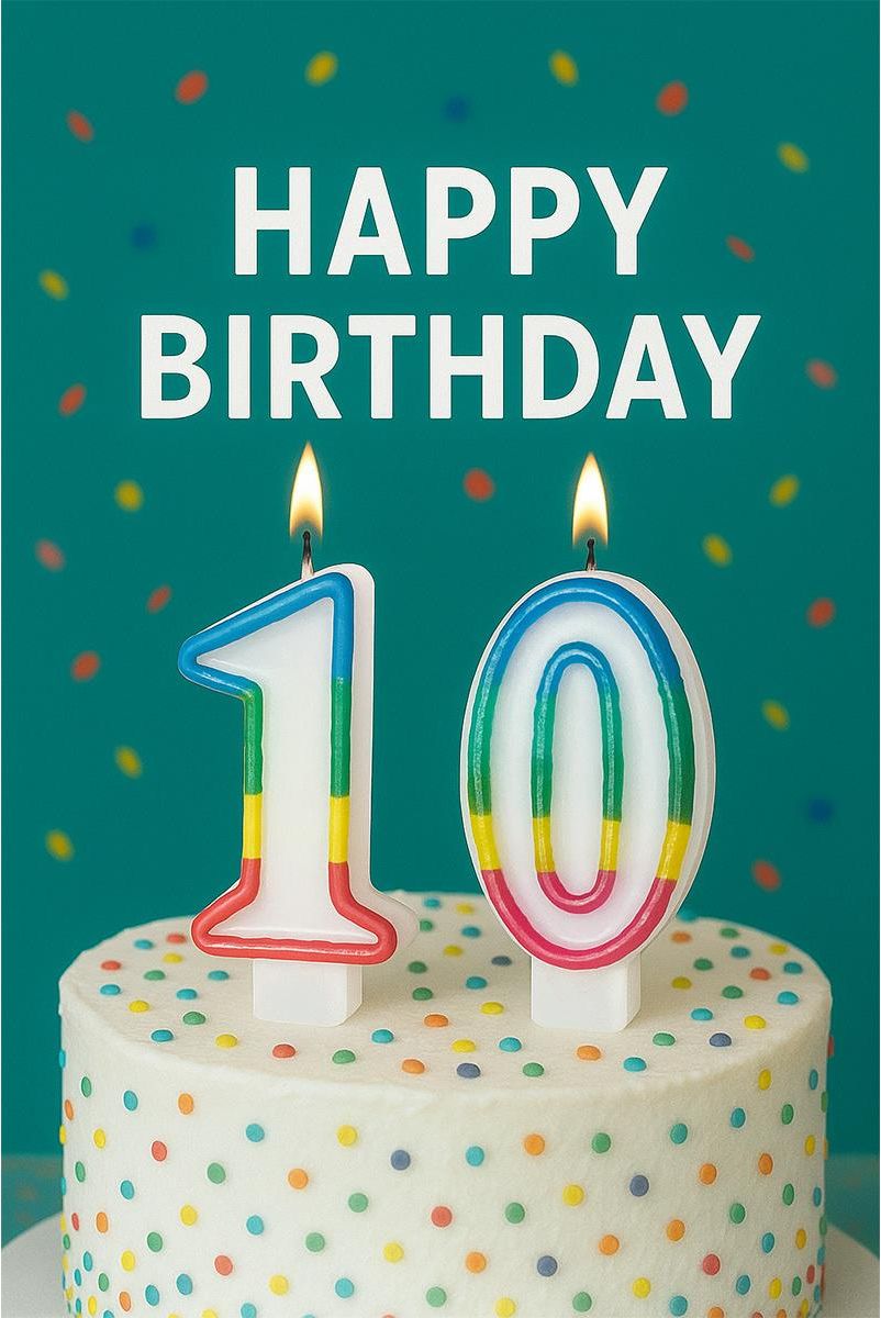 Świeczki urodzinowe cyferki dziesięć "10" z kolorową obwódką na dziesiąte urodziny. Wysokość: 8,5 cm. Opakowanie: 2 szt.