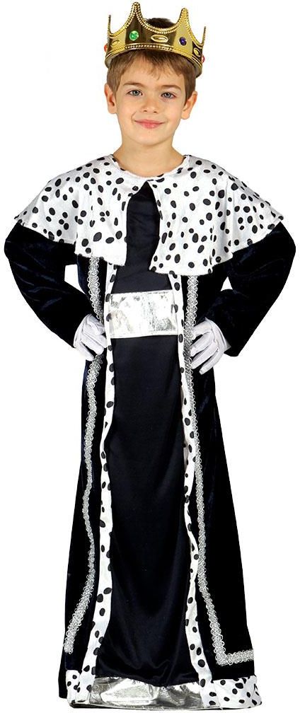 Szata króla z długim rękawem, wciągana przez głowę. W pasie wszyty srebrny pas. Szata dodatkowo zdobiona srebrną tasiemką i wzorem w grochy. Wykonana z materiału imitującego welur. Kolor: granatowo-biały. Skład: 100% poliester.
