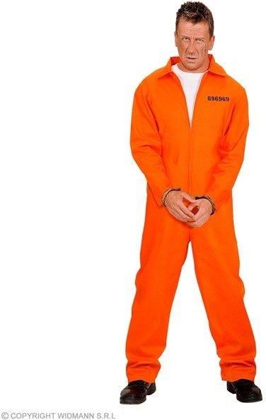 Kostium więźnia dla mężczyzny. W komplecie: pomarańczowy kombinezon, kajdanki. Rozmiar: M. Wykonany z poliestru.