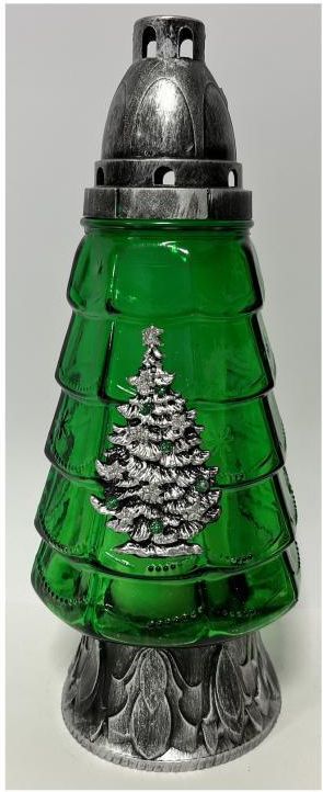 Znicz Z-76 zielona choinka firmy Rolchem Znicz na święta Bożego Narodzenia. Gdy chcesz odwiedzić grób bliskiej lub znanej Ci osoby. Gdy przyjdzie czas na zadumę i modlitwę możesz zabrać znicz symbol światła, przemijającego jak też i nowego życia. Duży, szklany znicz. Zielona choinka z piękną aplikacją srebrnego, brokatowego drzewka bożonarodzeniowego. Niech atmosfera świąt Bożego Narodzenia będzie obecna wszędzie. Specyfikacja Firma: Rolchem Kolor zdobień: srebrny Kształt: choinka Symbol: Z-76 Wysokość: 29 cm Przybliżony czas palenia: 48 h