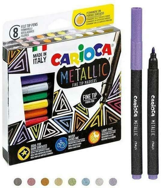 PISAKI METALICZNE CARIOCA 8 KOLORÓW Wysokiej jakości pisaki w 8 metalicznych kolorach. Idealny zestaw do efektownego wykończenia rysunku. Metaliczny połysk najlepiej jest osiągnąć używając ich na czarnym kartonie. idealne do ciemnych powierzchni trwałe kolory na porowatych powierzchniach, usuwalne …