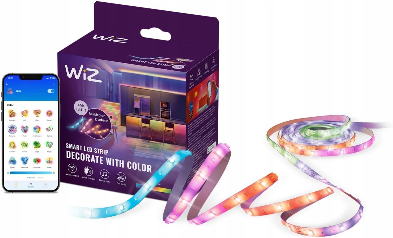 Taśma LED Pasek 10,2W RGBIC 4m Inteligentna SMART WiFi Bluetooth Aplikacja WiZ Aplikacja WiZ Connected Korzyści z zastosowania naszego produktu Wszystko w jednej aplikacji: Steruj światłem z telefonu aplikacją WiZ Connected Technologia RGBIC: Niezależne strefy kolorów – stwórz efektowne, wielobarwne oświetlenie ścian bez ograniczeń. Gotowe tryby świetlne: Wybieraj spośród dynamicznych i statycznych efektów albo spersonalizuj światło według własnych preferencji. Reakcja na muzykę: Światło pulsuje w rytmie Twoich ulubionych utworów – wystarczy podłączony smartfon. Wygodne sterowanie: Obsługuj taśme przez aplikację WiZ, akcesoria lub komendy głosowe – Google Home, Alexa, Siri. Dopasuj długość do swojej przestrzeni: Taśmę LED można łatwo przycinać i montować bez użycia narzędzi. Zgodność z Matter: Pełna współpraca z Twoim systemem smart home – Google Home, Alexa, Apple Home i inne obsługujące Matter. Odkryj nieograniczone możliwości oświetlenia z inteligentną taśmą LED WiZ RGBIC. Dzięki niej możesz całkowicie odmienić atmosferę swojego wnętrza, dostosowując barwy światła do nastroju, okazji lub aranżacji pomieszczenia. Taśma LED o mocy 10,2 W i długości 4 metrów pozwala na tworzenie wielokolorowych scen z efektem RGB oraz zmianę barwy światła dzięki technologii CCT. Obsługiwana przez aplikację mobilną WiZ Connected, umożliwia pełną kontrolę nad oświetleniem nawet, gdy jesteś poza domem, dzięki wbudowanej łączności WiFi i Bluetooth. Taśma zaprojektowana jest do użytku wewnętrznego, z możliwością ściemniania przez aplikację, co pozwala na pełne dostosowanie intensywności światła do twoich potrzeb. Wysoka trwałość – 15000 godzin i liczba cykli wyłączeniowych – 50000 to znak, że inwestujesz w produkt na długie lata. Postaw na nowoczesność i styl z taśmą LED WiZ! Wiele kolorów jednocześnie dzięki RGBIC! Dzięki technologii RGBIC taśma emituje jednocześnie kilka odcieni światła, płynnie przechodzących jeden w drugi. Tworzy to efektowną, żywą poświatę, która ożywia każdą przestrzeń – od nowoczesnego salonu po gamingowy setup. Zamiast statycznego światła zyskujesz dynamiczne, wielowymiarowe oświetlenie, które dodaje wnętrzu energii i charakteru. To nie tylko praktyczne źródło światła, ale również dekoracyjny akcent, który przyciąga uwagę i podkreśla styl pomieszczenia. Poczuj rytm – oświetlenie, które reaguje na muzykę! Zanurz się w rytmie i spraw, by światło tańczyło razem z dźwiękiem. Dzięki funkcji synchronizacji z muzyką Twoje oświetlenie pulsuje i zmienia kolory w czasie rzeczywistym, dopasowując się do tempa i klimatu utworów. To idealny sposób na stworzenie wyjątkowego nastroju – podczas imprezy, relaksu czy domowego koncertu. Wystarczy, że trzymasz smartfon blisko głośnika, a system WiZ sam zsynchronizuje dźwięk ze światłem – bez kabli, mikrofonów i skomplikowanej konfiguracji. Światło, które inspiruje – miliony kolorów, setki możliwości! Dostęp do 16 milionów kolorów pozwala stworzyć wyjątkową atmosferę w każdym wnętrzu – od relaksu po pełną energii zabawę. Kolorowe światło to przestrzeń do wyrażania siebie, eksperymentowania i zabawy światłem. Dostosuj barwy do okazji, pory dnia lub po prostu swojego nastroju. Dzieci pokochają tworzenie bajkowych scen, a dorośli docenią możliwość pełnej personalizacji wnętrza. Twoje światło, Twój świat – każdego dnia wyjątkowy. Dostosuj długość. Zainstaluj gdzie chcesz. Bez wysiłku. Taśma LED WiZ została zaprojektowana z myślą o maksymalnej elastyczności. Możesz ją przyciąć w wyznaczonych miejscach, aby idealnie dopasować długość do swojej przestrzeni – niezależnie od tego, czy montujesz ją wzdłuż mebli, sufitu, ściany czy za ekranem. Prosty montaż dzięki samoprzylepnej warstwie i dołączonym uchwytom sprawia, że nie potrzebujesz żadnych narzędzi ani specjalistycznej wiedzy. Zmierz, przyklej, podłącz – efektowne oświetlenie gotowe w kilka minut. Obszar zastosowań Oświetlenie dekoracyjne wnętrz: Idealna do stosowania w salonach, sypialniach czy jadalniach, gdzie potrzebne jest stworzenie przyjemnej i relaksującej atmosfery. Oświetlenie akcentowe: Możliwość podkreślenia elementów wyposażenia wnętrz, takich jak półki, gabloty lub obrazy. Oświetlenie wydarzeń i imprez: Tworzenie kolorowych efektów świetlnych podczas spotkań towarzyskich, uroczystości czy imprez domowych. Strefy rozrywki: Montaż w pobliżu sprzętu AV, projektorów czy monitorów do tworzenia atmosfery dopasowanej do treści multimedialnych. Biura domowe: Poprawa komfortu pracy poprzez regulację oświetlenia w zależności od pory dnia i potrzeb użytkownika. Przestrzenie handlowe: Witryny sklepowe czy wnętrza punktów sprzedaży dzięki odpowiedniemu oświetleniu mogą przyciągać wzrok klientów. Obiekty komercyjne: Restauracje, hotele czy kafejki mogą korzystać z możliwości ustawienia odpowiednich scen oświetleniowych w zależności od wymagań chwili. Zainteresowany? Sprawdź, co jeszcze oferuje WiZ WiZ – Twoja prywatność, Twój wybór: Anonimowość i bezpieczeństwo W świecie, gdzie prywatność staje się luksusem, WiZ stoi na straży Twojej prywatności i bezpieczeństwa. Dzięki zaawansowanym technologiom szyfrowania i niezawodnym zabezpieczeniom WiZ zapewnia, że Twoje dane pozostają tylko Twoje. Aplikacja WiZ nie pobiera, nie przechowuje ani nie wykorzystuje żadnych informacji związanych z użytkownikiem. Dostęp do SMART HOME z dowolnego miejsca. Steruj wszystkimi światłami WiZ z dowolnego miejsca na świecie. Wystarczy, że nasz smartfon ma dostęp do internetu, a sterowany produkt jest w zasięgu domowej sieci Wi-Fi. Wakacje? Spraw, aby wyglądało na to, że ktoś jest w domu, automatycznie włączając i wyłączając światła WiZ, symulując obecność w domu i zniechęcając 