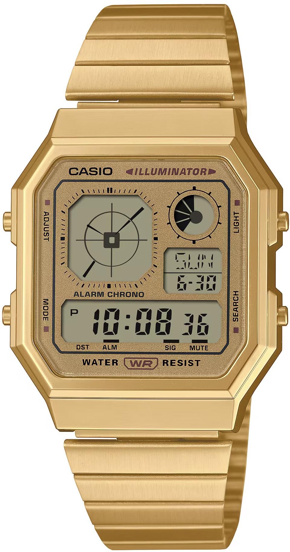 ZEGAREK CASIO A130WEG-9AEF VINTAGE GOLD NA BRANSOLECIE STOPER Fabrycznie nowy, oryginalny zegarek Casio A130WEG-9AEF świetnie sprawdzi się dla osób szukających retro zegarka na bransolecie, ale pragnących zachować możliwość korzystania z nowoczesnych udogodnień. Wewnątrz działa niezawodny mechanizm kwarcowy, który dzięki wydajnej baterii zapewnia długotrwałą precyzję i bezproblemowe użytkowanie. Cyferblat prezentuje wszystko w przejrzysty sposób – z lewej strony widoczny jest czas lokalny w formie analogowej, a z prawej graficzne oznaczenia aktywnych funkcji. Specyfikacja zegarka Mechanizm: kwarcowy MIYOTA made in japan - zasilany baterią. Automatyczny kalendarz: rozbudowany datownik, który automatycznie dopasowuje datę w przypadku krótszych miesięcy. Czas światowy: zegarek posiada wyświetlanie czasu w różnych strefach czasowych. Zegar 12/24: możliwość wyświetlania godziny w trybach 12 i 24 godzinnych. Stoper: 1/10 mierzy czas do jednej dziesiątej sekundy. Alarm: zegarek może sygnałem dźwiękowym informować 5 razy w ciągu doby. Iluminator: możliwość podświetlenia tarczy diodą LED Koperta: wysokiej jakości koperta z tworzywa sztucznego o dużej wytrzymałości. Szkiełko: wykonane z przejrzystego tworzywa sztucznego, łatwe do wypolerowania - płaskie. Bransoleta: wykonana z wysokiej jakości stali szlachetnej. Stop ten charakteryzuje się najwyższym stopniem odporności na korozję. Wodoszczelność: klasa wodoszczelności - WR. Odporny na deszcz i zachlapania. Dekielek: zakręcany. Kolorystyka koperta: złota tarcza: szara, złota bransoleta: złota Alarm z możliwością ustawienia aż pięciu przypomnień dziennie oraz precyzyjny stoper i timer pozwalają na doskonałą organizację dnia. Automatyczny kalendarz zapewnia stałe wyświetlanie poprawnej daty, uwzględniając krótsze miesiące. Zegarek został wyposażony w pomarańczowe podświetlenie LED, które umożliwia łatwe odczytanie godziny nawet w ciemności. Czas trwania podświetlenia można dostosować do indywidualnych potrzeb – do wyboru są opcje 1,5 sekundy oraz 3 sekundy. Dostępna jest również opcja sygnalizacji o pełnych godzinach. Wymiary koperta: szerokość 34mm, wysokość 41mm tarcza: szerokość 26mm, wysokość 26mm szerokość bransolety: 18mm grubość zegarka: 9mm obwód zegarka do 19,5cm (możliwość regulacji) waga zegarka: 54g W zamówieniu otrzymasz fabrycznie nowy i oryginalny zegarek kartę gwarancyjną wraz z potwierdzeniem zamówienia książeczkę od producenta (jeżeli takową producent załączył) oryginalne pudełko - zegarek zapakowany jest w oryginalne opakowanie, które nadaje się na prezent.