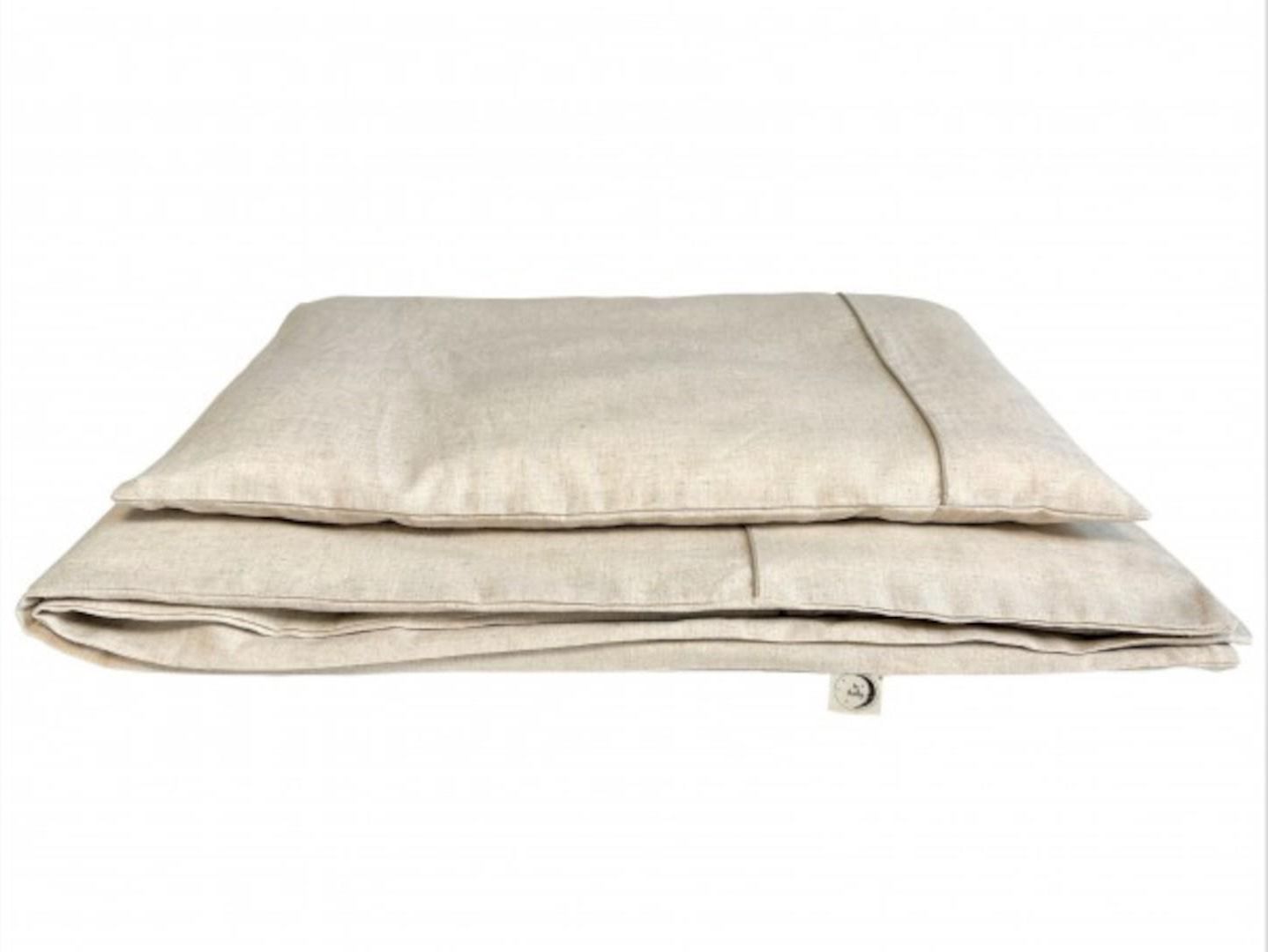 Komplet pościeli do łóżeczka dziecięcego, uszyty z miękkiej tkaniny lniano-bawełnianej w naturalnym, beżowym kolorze. Składa się z poszewki na poduszkę (40x60 cm) i na kołderkę (100x135 cm lub 90x120 cm). Poszewki zamykane są na bezpieczne zamki. Tkanina wybrana z myślą o delikatnej skórze dziecka, utkana z naturalnych włókien.