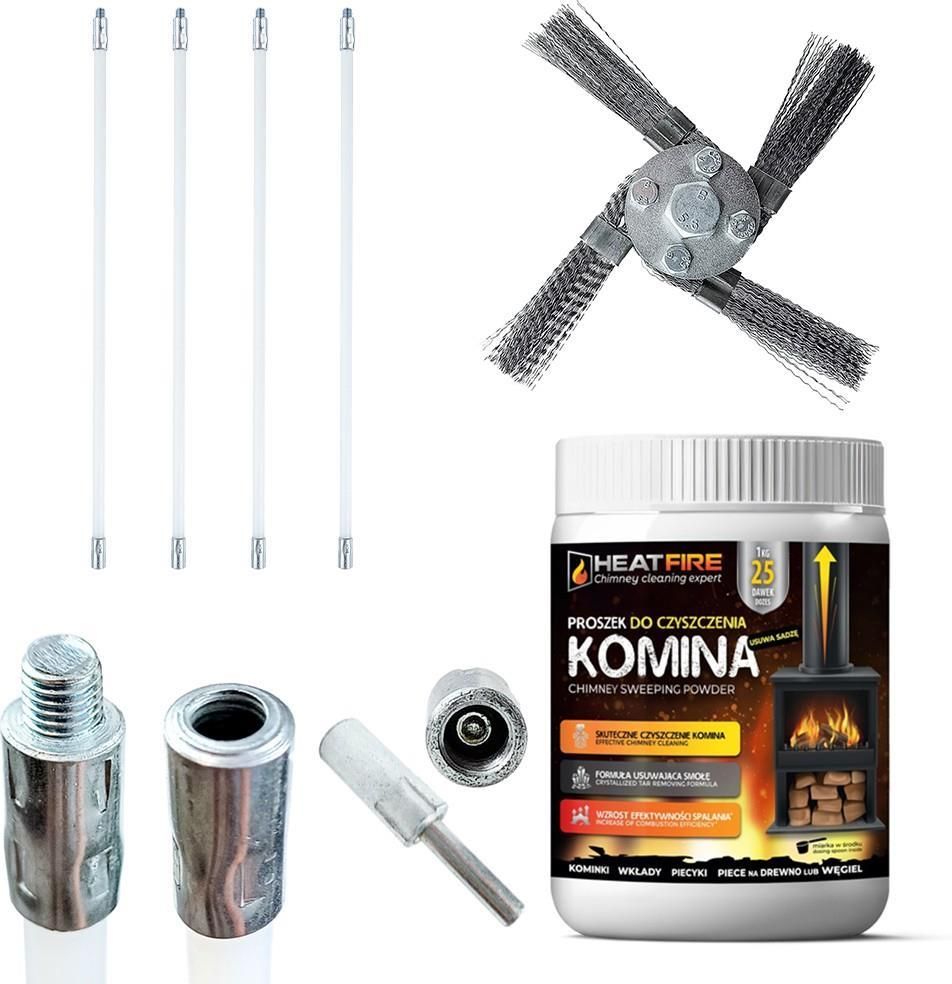 Zestaw szczotki do czyszczenia komina zawiera adapter do wiertarki, 4 kije przedłużające 1m oraz 4-pęczkową głowicę ze stali falowanej, zapewniającą skuteczne usuwanie sadzy. Idealny do samodzielnego użytku, łatwy w montażu i obsłudze. W gratisie otrzymasz proszek do czyszczenia komina Heatfire, który wspomaga czyszczenie kominka, usuwa sadzę i smołę, utrzymuje czystość przewodu kominowego.