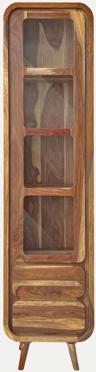 Opis produktu Realizacja zamówienia może potrwać od 21 do 90 dni roboczych. Zalecamy potwierdzenie dokładnego terminu przed złożeniem zamówienia. Witryna Celina to mebel, który został zaprojektowany w estetyce vintage. Zachwyca niepowtarzalnym wyglądem. Biblioteczka doskonale nada się do jadalni lub kuchni dzięki swoim pojemnym półkom i szufladom. Matowe wykończenie i naturalne usłojenie drewna nadają jej eleganckiego i niepowtarzalnego wyglądu. Będzie wspaniałą ozdobą Twojego salonu czy sypialni. Celina dostępna jest w wersji zrobionej z mango indyjskiego lub palisandru indyjskiego. Ponadto, można wybrać jeden z pięciu kolorów: bursztyn, karmel, miód oraz czekolada i krowa. Dane produktu Dla podanych wymiarów mebli obowiązuje tolerancja +- 3% Głębokość szuflady: 26 cm Wysokość szuflady: 14 cm Szerokość szuflady: 36 cm Głębokość półek: 28 cm Wysokość półek: dolna, 33 cm, pozostałe 28 cm Szerokość półek: 37 cm