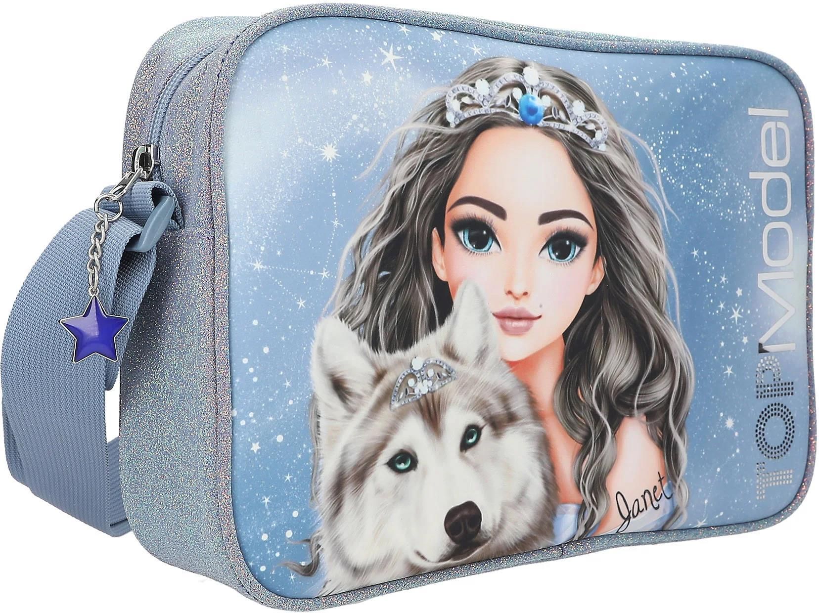 Torba na ramię dla dziewczynek na czas wolny, wakacje i wycieczki Design: TOPModel Wolf by Depesche - W kolorze ciemnoniebieskim, z motywem modelki i wilka, gwiaździstym niebem i mnóstwem brokatu z boku Wyposażony w regulowany pasek na ramię do wygodnego noszenia i przestronną komorę główną Fajny …