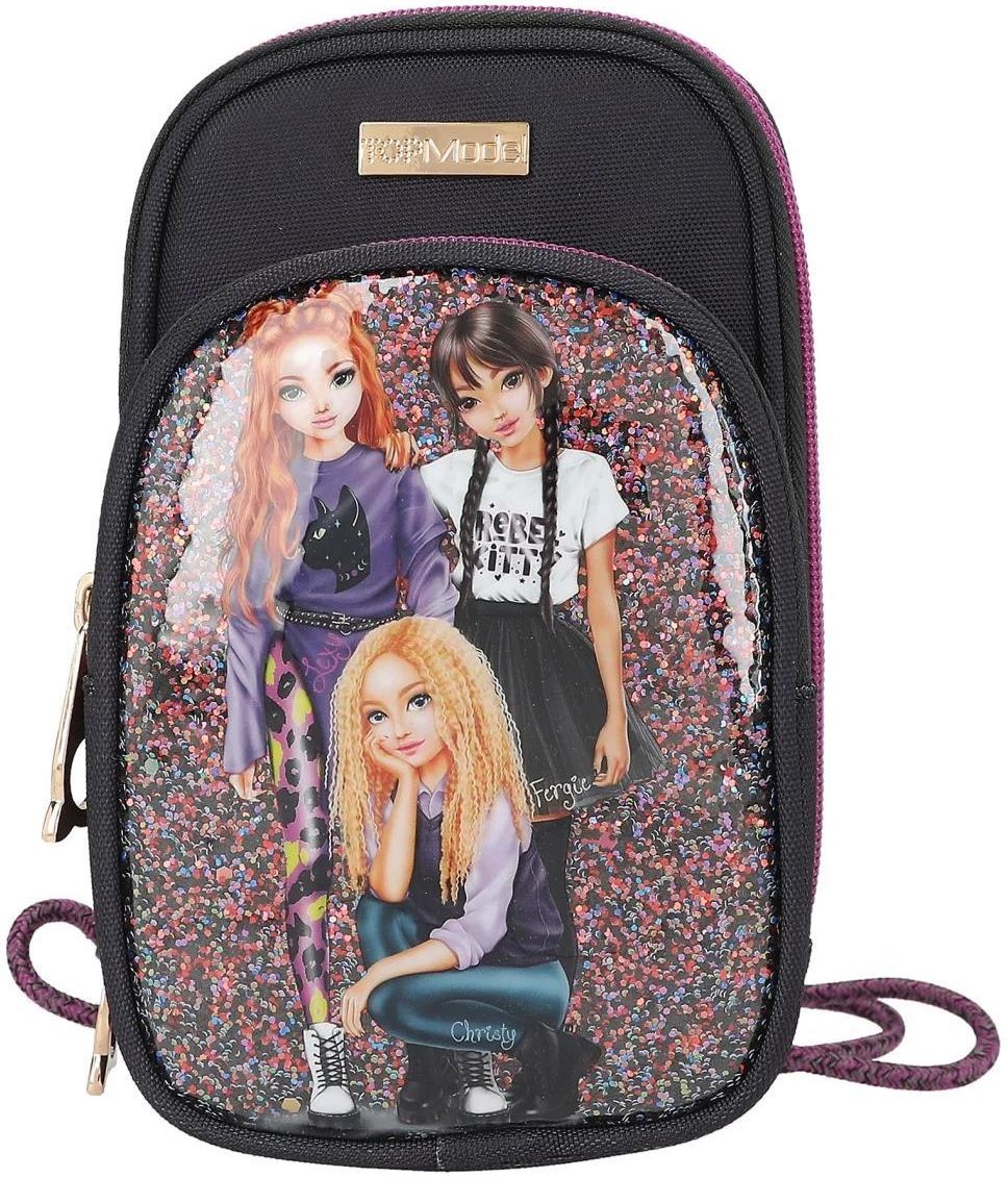 Rebel Kitty: Czarno-fioletowa torba na smartfona TOPModel ma fajny motyw nadruku z brokatem z przodu, 2 przegrody z zamkami błyskawicznymi (uchwyty w kształcie kota, urocze!) i sznurek do zawieszania na szyi. Materiał: 100% poliester; przód 100% PVC