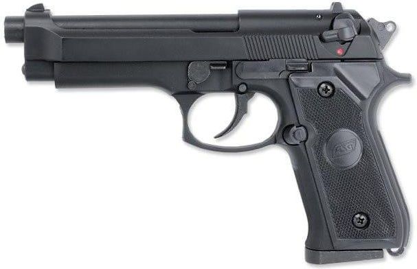 Replika Beretty 92F wyprodukowana przez firmę STTi dla ASGDK. Jest to nowa poprawiona wersja tej repliki o zwiększonej mocy. Pistolet wykonany jest z mocnego kompozytu w kolorze czarnym-matowym. Replika nie posiada oryginalnych nadruków ale pozostałe detale są takie same jak w oryginale. Replika napędzana jest Green Gazem ładowanym poprzez zawór do metalowego magazynka. Brak odrzutu zamka powoduje, że pistolet jest bardziej ekonomiczny w użytkowaniu. Zamek jest ruchomy i może służyć do przeładowania broni. Dobrej jakości aluminiowa lufa i duża moc sprawiają, że skuteczny zasięg wynosi około 35-40 metrów. W magazynku w dwóch rzędach mieści się 21 kulek. Jest to idealny pistolet dla osób rozpoczynających przygodę z ASG. Napędzany gazem, bardzo mocny i dobrze wykonany. W komplecie: Pistolet Magazynek Instrukcja Gwarancja Dane techniczne: Model: BERETTA M92F Producent: ASG Kaliber: 6 mm Pojemność magazynka: 21 kulek Długość całkowita: 230 mm Energia kinet.: 0,9 J Prędkość początkowa: 85 m/s Waga: 620g Kolor: Czarny Broń dostępna bez zezwolenia. Energia pocisku nie przekracza wartości 17 J