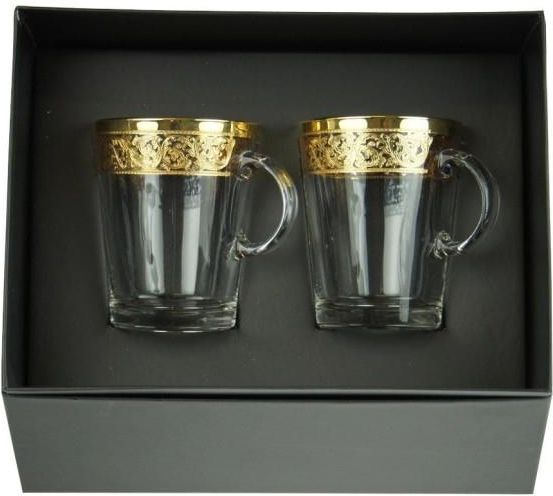 Dekoracja wykonana w naszym zakładzie w Opolu metodą trawienia w szkle.Malowane ręcznie 24 karatowym złotem .Filiżanka wykonana jest ze szkła hartowanego, które jest 2-3 razy bardziej odporne na uszkodzenia niż porcelitowe czy porcelanowe produkty o podobnej grubości. Komplet składa się z: 2 x szklanka