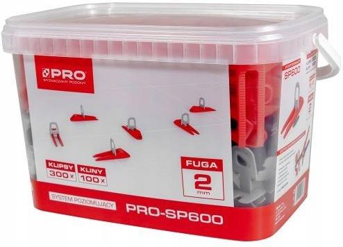 SYSTEM POZIOMUJĄCY PRO-SP600 2MM MIX - KLIPSY/KLINY 300/100 SZT + WIADRO 5L SYSTEM POZIOMUJĄCY PRO-SP600 Komplet 2 mm + wiadro 5 litrówKlipsy - 300 szt.Kliny - 100 szt.Szerokość fugi: 2 mmMateriał: polipropylenSystem poziomujący: Trudno uzyskać efekt dobrze ułożonej glazury bez odpowiednich akcesoriów. Dlatego w naszej ofercie umieściliśmy systemy poziomujące, które pozwolą Ci na stworzenie idealnie równej powierzchni. Wykorzystanie systemów poziomujących to nowoczesna metoda, która pozwala znacznie skrócić czas pracy, zwiększyć wydajność oraz oczywiście idealnie ułożyć glazurę na podłodze czy ścianie. Systemy poziomujące PRO przeznaczone są do układania płytek o różnej wielkości. Liczba poszczególnych elementów potrzebnych do ułożenia glazury uzależniona jest od wymiarów płytek – im będą one większe, tym oczywiście więcej klinów i klipsów będziesz potrzebować. Pamiętaj, że kliny to elementy przeznaczone do wielokrotnego użytku, dlatego nie musisz ich wyrzucać, a możesz użyć ponownie w przyszłości (wyrzuć tylko resztki klipsów). Wybierz systemy poziomujące od firmy PRO i zadbaj o idealne wyrównanie i wypoziomowanie glazury. 5901571524856 024525