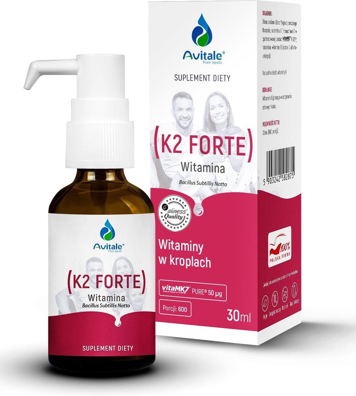 pomaga w utrzymaniu zdrowych kości Podwójna dawka naturalnej witaminy K z fermentacji bakterii Bacillus Subtillis Natto Jedna kropla produktu zawiera podwójną dawkę aż 50 µg naturalnej witaminy K2 mk7 w opatentowanej postaci VitaMK7. Witamina została rozpuszczona w oliwie z oliwek z pierwszego tłoczenia, dzięki czemu odznacza się wysoką przyswajalnością. Witamina K w opatentowanej postaci VitaMK7the most advanced K2 Menaquinone 7 product in the market?, to jedno z najlepszych naturalnych źródeł wita­miny K, bardzo dobrze przyswajalnej, przeba­danej oraz o udokumentowanym działaniu za­opiniowanym przez EFSA (Europejska Agencja d.s. żywności). VitaMK7 pozyskiwana jest w drodze fermen­tacji Bacillus Subtilis Natto i przy użyciu obojęt­nego chemicznie CO-2. Menachinon -7 będący naturalnym źródłem Witaminy K marki Avitale pochodzi od jedynego producenta Europej­skiego.