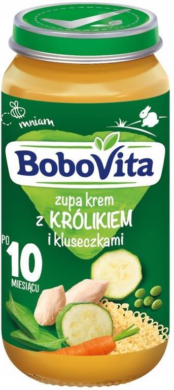 BoboVita Mus banan z jagodami i czarną porzeczką po 6 miesiącu 80g Opis produktu BoboVita Zupa krem z królikiem i kluseczkami po 10 miesiącu, 250 g Produkt przeznaczony dla niemowląt po 10. miesiącu życia. Smakowita zupka z delikatnym królikiem, kluseczkami i wartościową cukinią w słoiczku. Ze …