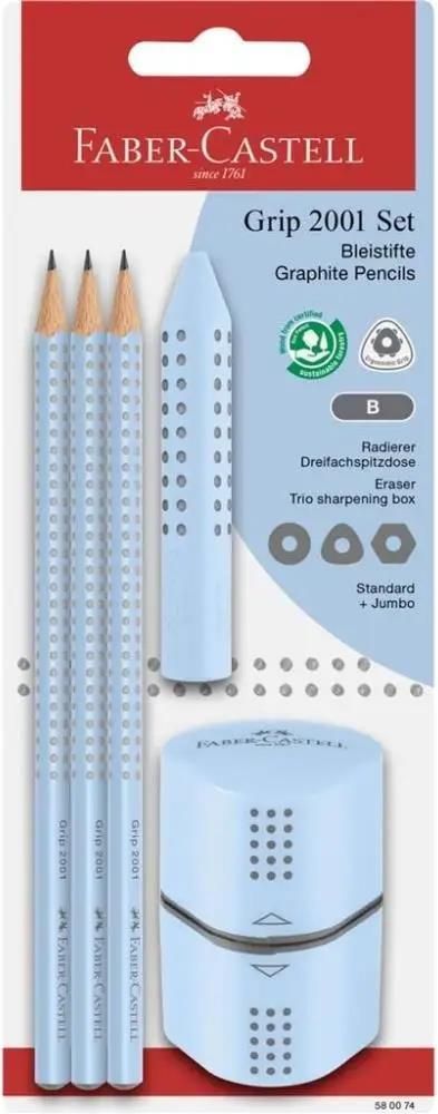 Faber Castell Ołówek 3Szt. Gumka Temperówka Grip Błękitny Turek