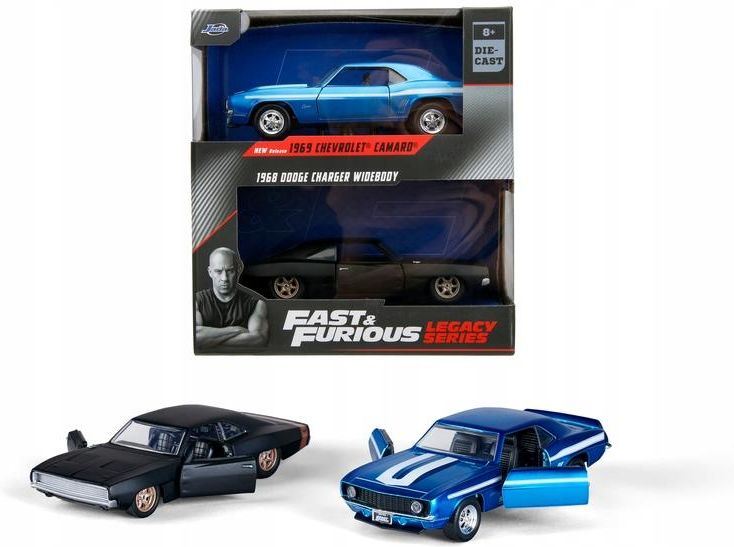 Jada Toys - Fast and Furious cars (set of 2) - 1969 Chevrolet Camaro & 1968 Dodge Charger Widebody - two Legacy Series model cars with opening doors, 1:32, 7.5 in (19 cm), ages 8 & up, wave 2, set 1 Fast and Furious twin pack – set of two toy cars from the Legacy Series wave 2, pack 1 • Two …