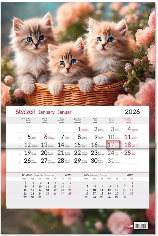 Kalendarz jednodzielny ścienny 2026 Nigdy nie trać poczucia czasu dzięki naszemu eleganckiemu i stylowemu kalendarzowi! Organizuj swoje dni, planuj tygodnie i miesiące oraz osiągaj swoje cele, podziwiając piękne fotografie. Zdobądź jeden już dziś i pilnuj swojego harmonogramu w dobrym stylu! Cechy produktu Format kalendarza 31,5 x 47,5 cm Główka płaska 31,5 x 21 cm Kalendarium 29 x 11 cm Układ kalendarza: bierzący miesiąc na stronie, a poprzedni i następny poniżej w uproszczonej wersji Kalendarz zawiera informacje o imieninach oraz świętach Otwór pozwalający na zawieszenie na ścianie Papier karton 350 g/m2 Kalendarium - offset 70 g/m2 Jeśli to nie Twój wzór zapraszamy do obejrzenia innych naszych aukcji