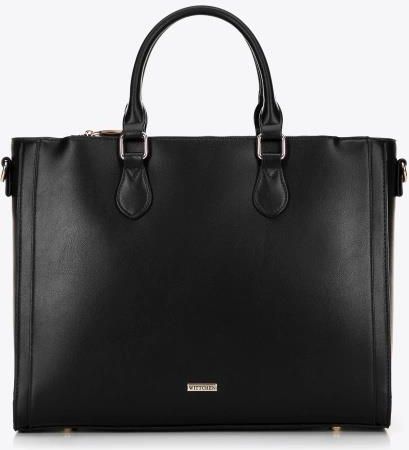 Stylowa torba na laptopa ze skóry ekologicznej Elegancka torba na laptopa, wykonana z ekoskóry, łączy funkcjonalność z nowoczesnym designem. Posiada dwie rączki oraz regulowany, odpinany pasek, dzięki czemu możesz dostosować sposób noszenia do swoich potrzeb. Wyściełana kieszeń pomieści laptop o wymiarach 21 × 32 cm (14,5”). Cztery nóżki na spodzie ochronią ją przed zarysowaniami, zachowując estetyczny wygląd przez długi czas. Idealna dla Ciebie, jeśli szukasz torby, która połączy styl z wygodą użytkowania! Dla kogo? Jeśli szukasz torby, która pomieści Twój laptop i akcesoria w jednym, zapewniając Ci wygodę i styl, to ta torba będzie idealnym wyborem. Doskonale sprawdzi się w codziennym użytkowaniu, zarówno w pracy, jak i podczas spotkań biznesowych czy podróży. Opis produktu wymiary zewnętrzne: 28 x 38 x 4 - 11 cm materiał: skóra ekologiczna, podszewka 100% poliester sposób noszenia: do ręki, na ramię wnętrze: jedna główna komora zamykana na zamek oraz dwie mniejsze po bokach również zamykane na zamek, wewnątrz przegroda na laptopa 14,5", dwie kieszonki na drobiazgi waga: 0,62 kg długość uchwytów: 38 cm elementy metalowe: złote 2 lata gwarancji producenta
