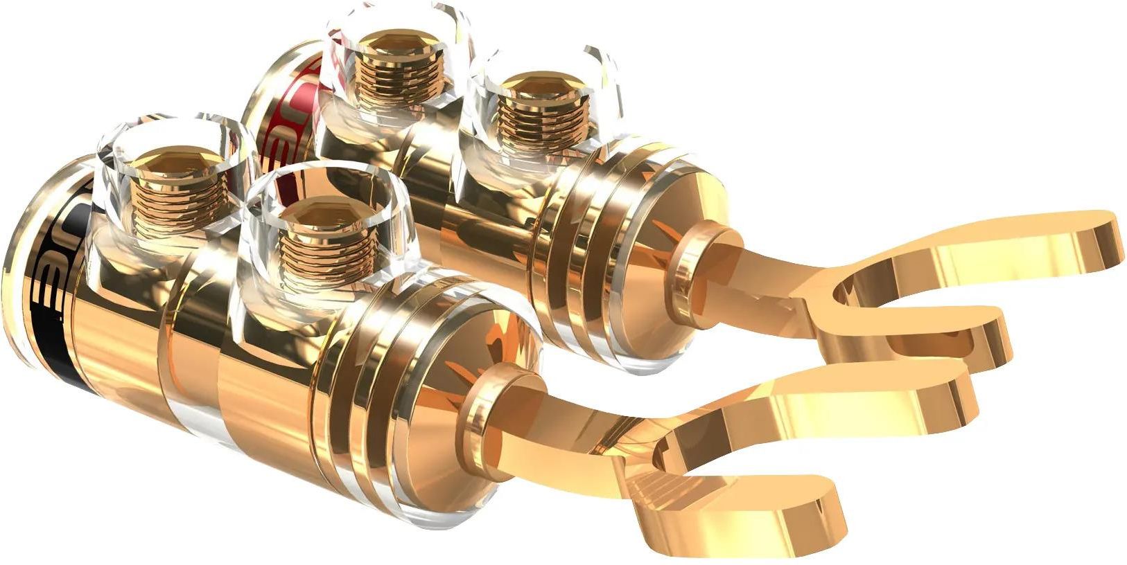 VIABLUE TS Spades Plugs 8 mm (4 szt.) VIABLUE TS Spades Plugs 8 mm to high-endowe złącza głośnikowe, które łączą najwyższą jakość wykonania z wygodą montażu bez lutowania. Pozłacane styki 24-karatowym złotem zapewniają doskonałą transmisję sygnału i pełną niezawodność, a kompaktowa konstrukcja gwarantuje stabilne mocowanie na terminalach głośnikowych. To idealny wybór dla wymagających systemów audio, gdzie liczy się zarówno perfekcyjny dźwięk, jak i trwałość połączeń. Wygodny montaż bez lutowania Styki pokryte prawdziwym złotem 24-karatowym Zabezpieczenie przed zwarciem dzięki przezroczystej osłonie izolacyjnej Obsługa kabli o średnicy do Ø 5 mm Montaż przewodu za pomocą dwóch śrub imbusowych M4 (1,5 mm) Szerokość widełki: 8 mm Instrukcja montażuRekomendacja: stosowanie tulejek zaciskowych VIABLUE OFC Crimp Sleeves, które chronią przewody przed załamaniem i przypadkowym uszkodzeniem żył kabla. Specyfikacja techniczna: Szerokość obudowy: 11 mm Wysokość obudowy: 14 mm Długość obudowy: 25,5 mm Styk widełkowy zapewniający pewne mocowanie na terminalu głośnikowym Długość styku: 16,5 mm Szerokość styku: 14 mm Otwór widełki: 8 mm Maksymalne wejście kabla: 5,5 mm Montaż przewodu za pomocą dwóch śrub imbusowych M4 (1,5 mm)
