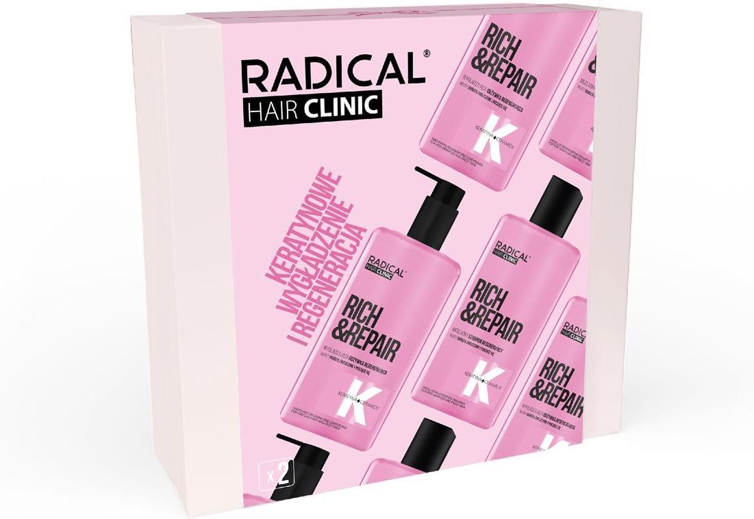 Twoje włosy potrzebują troski tak samo, jak Ty. Zestaw Radical® Hair Clinic to intensywna kuracja do włosów zniszczonych i podatnych na puszenie. Micelarny szampon regenerujący oraz wygładzająca odżywka tworzą duet, który:- skutecznie oczyszcza i pielęgnuje skórę głowy, odbudowuje strukturę włosa, wzmacnia, nawilża i wygładza pasma na całej długości. Formuły wzbogacone o keratynę, ceramidy, biotynę i oleje roślinne wspierają regenerację włosów, poprawiają ich kondycję i nadają im zdrowy, lśniący wygląd. Efekt? Włosy silniejsze, gładsze i łatwiejsze w układaniu każdego dnia. W skład zestawu wchodzą: ?Micelarny szampon regenerujący, e 300 ml ?Wygładzająca odżywka regenerująca, e 260 ml Ostrzeżenia: tylko do użytku zewnętrznego Skład (INCI): Micelarny szampon regenerujący, e 300 ml / 10,14 fl.oz. SKŁADNIKI/INGREDIENTS: Aqua (Water), Disodium Laureth Sulfosuccinate, Ammonium Lauryl Sulfate, Cocamidopropyl Betaine, Parfum (Fragrance), Equisetum Arvense (Horsetail) Leaf Extract, Hydrolyzed Keratin, Cetrimonium Chloride, Caprylyl/Capryl Glucoside, Lactis Lipida (Milk Lipids), Biotin, Ceramide NP, Hydroxypropyl Guar Hydroxypropyltrimonium Chloride, Urea, Glycerin, Sodium Chloride, Tocopherol, Lactic Acid, Sodium Citrate, Citric Acid, Disodium Phosphate, Disodium EDTA, Sodium Benzoate, Potassium Sorbate, Sodium Sulfate, Phenoxyethanol, Ethylhexylglycerin. Dehydroacetic Acid, Benzyl Alcohol, CI 17200, Hexyl Cinnamal, Linalool, Tetramethyl Acetyloctahydronaphthalenes. Wygładzająca odżywka regenerująca, e 260 ml / 8,79 fl.oz. SKŁADNIKI/INGREDIENTS: Aqua (Water), Glycerin, Cetearyl Alcohol, Prunus Amygdalus Dulcis (Sweet Almond) Oil, Brassicamidopropyl Dimethylamine, Stearyl Alcohol, Amodimethicone, Dicocoyl Pentaerythrityl Distearyl Citrate, Equisetum Arvense (Horsetail) Leaf Extract, Hydrolyzed Keratin, Hydrolyzed Silk, Biotin, Ceramide NG, Olea Europaea (Olive) Fruit Oil, Ricinus Communis (Castor) Seed Oil, Guar Hydroxypropyltrimonium Chloride, Urea, Hydroxyethylcellulose, Tocopheryl Acetate, Lactic Acid, Disodium Phosphate, Citric Acid, Disodium EDTA, Phenoxyethanol, Ethylhexylglycerin, Sodium Benzoate, Potassium Sorbate, Parfum (Fragrance), CI 17200, Hexyl Cinnamal, Linalool, Tetramethyl Acetyloctahydronaphthalenes. *Składy naszych kosmetyków są regularnie aktualizowane. Zapoznaj się z listą składników ("Ingredients") na opakowaniu wyrobu, gdzie zawsze znajduje się aktualny skład, aby upewnić się, że jest on dopasowany do Twoich potrzeb.