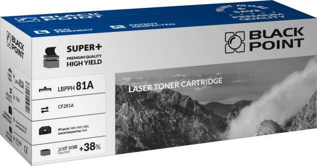 Toner laserowy Black Point Super Plus LBPPH81A. Zastepuje HP CF281A. Wydajnosc: 14500 str. (wiecej o 4000 str. od OEM ISO 19752) Kompatybilny z HP LaserJet Enterprise Flow M630z, M630dn, M630f, M630h LaserJet M604DN, M604N, M605dn, M605n, M605X, M606DN, M606X Dane Techniczne Wydajność BP 14500 NR CN 84439990 Kolor black Producent OEM HP Black Point. Bez problemu. Bez małych udoskonaleń świata nie ma wielkich odkryć. Tonery, tusze to małe i czasem kłopotliwe przedmioty. BLACKPOINT wymyślił sposoby ich modyfikacji – ulepszanie druku, bez którego nie byłoby ludzkiej cywilizacji. Środowisko -bez zmian. W naszych firmach i domach trzeba czasem coś wydrukować. Staramy się te mało ekologiczne czynności uczynić jak najmniej bolesnymi dla środowiska naturalnego. Modyfikujemy i usprawniamy działanie materiałów eksploatacyjnych do druku, by Ziemię pozostawić bez zmian – jest wystarczająco udana. Wydajność Black Point – dziś już legendarna. Opatentowany sposób projektowania, produkowania i testowania tuszów i tonerów żeby parametry ich użytkowania były najlepsze na rynku. Szkoda, że drukarki nie mają głosu – BLACKPOINT miałby niezłe wsparcie.
