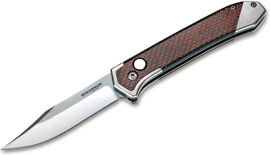 Opis Magnum Rubico Auto to nowoczesny nóż automatyczny, który łączy innowacyjne materiały z solidnym mechanizmem sprężynowym. Ostrze wykonane ze stali 440A ma wykończenie w stylu stonewash, a jego automatyczne otwieranie jest kontrolowane przyciskiem. Wciśnięcie przycisku ponownie zamyka ostrze. Rękojeść z włókna węglowego z subtelnym czerwonym połyskiem nadaje nożowi elegancki i nowoczesny wygląd. Nóż wyposażony jest w klips (tip-up), co ułatwia jego codzienne noszenie. Parametry Długość całkowita: 19,50 cm Długość ostrza: 8,50 cm Grubość ostrza: 3,00 mm Waga: 135,00 g Materiał ostrza: Stal 440A Materiał rękojeści: Włókno węglowe, stal nierdzewna Typ otwierania: Automatyczny (przycisk) Zamek: Button Lock Kolor: Czarny