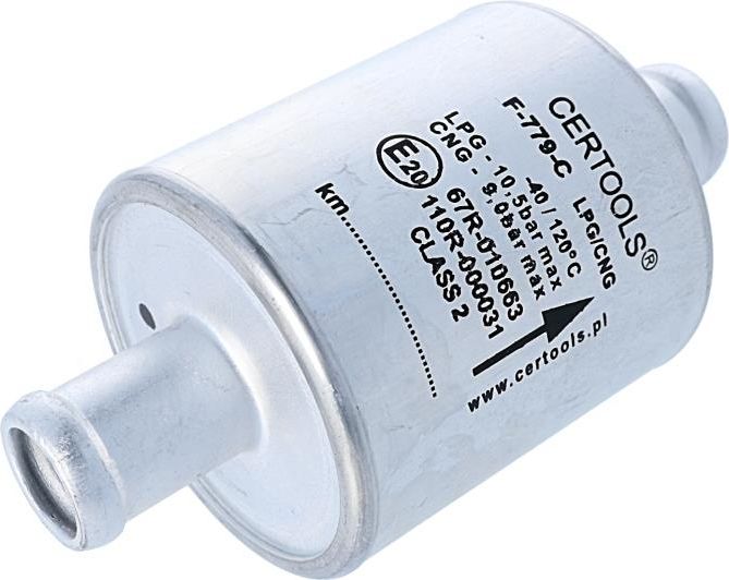 Opis produktu Filtr fazy lotnej model F-779-C firmy Certools. Zalecana wymiana wkładu co 20 000 km. Opis zastosowania Filtr fazy lotnej stosowany w układach czwartej generacji, sekwencyjnego wtrysku gazu w fazie lotnej, chroni listwę wtryskiwaczy przed zanieczyszczeniem i uszkodzeniem. Dane techniczne Aluminiowy jednorazowy filtr z wkładem bibułowym. Króciec wejścia gazu o średnicy 16 milimetrów, króciec wyjścia gazu o średnicy 16 milimetrów, długość całkowita 99 milimetrów, określony na obudowie kierunek przepływu gazu. Ciśnienie kwalifikacyjne 450 kPa, zakres zalecanej temperatury pracy od -40 do +120 stopni Celsjusza. E20-67R-010663 E20-110R-000031 Cechy produktu Typ filtra: jednorazowy Wkład: bibuła (papier) Wejście: 16 mm Wyjście: 16 mm Obudowa: metal Sposób montażu: na przewodzie Informacje dodatkowe Kod produktu Nagaz: 32.CRT.467 Producent: CERTOOLS Kod producenta: 53-779-016016 Numer homologacji: E20-67R-010663