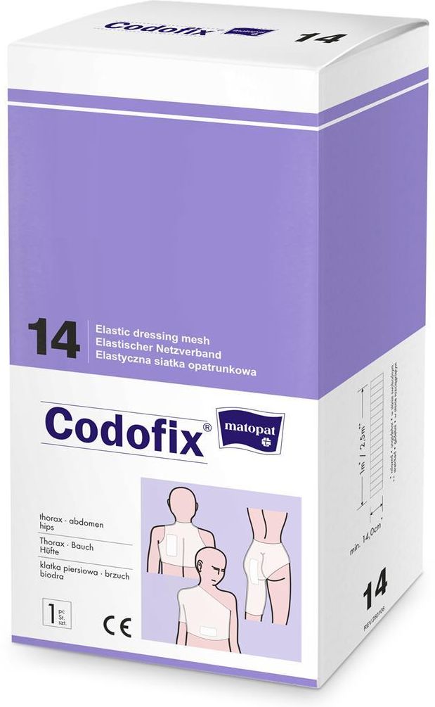 Matopat Codofix® elastyczna siatka opatrunkowa 14 cm x 1 m - to wyrób medyczny przeznaczony do podtrzymywania opatrunków na ciele. Skutecznie podtrzymuje opatrunek zabezpieczający ranę na powierzchni klatki piersiowej i brzucha. Niejałowa siatka opatrunkowa z powodzeniem zastępuje tradycyjny bandaż lub przylepiec.