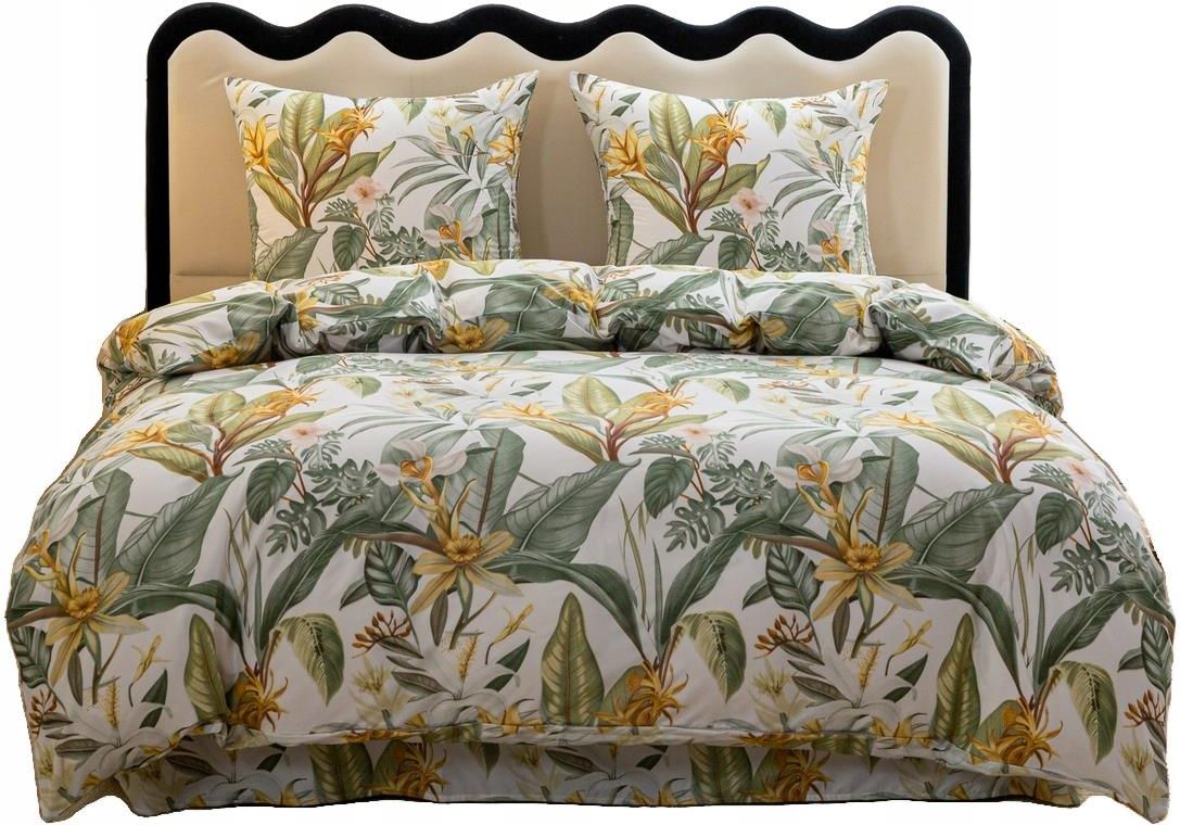 Delikatna biel tła pościeli stanowi idealne płótno dla wyrazistych, tropikalnych motywów roślinnych. Soczyste liście i barwne kwiaty tworzą kompozycję inspirowaną botanicznym ogrodem w stylu urban jungle. Wzór przywodzi na myśl letnią świeżość i egzotyczne podróże, wprowadzając do sypialni naturalny klimat relaksu. Tkanina z której uszyto pościel jest delikatna i miękka, oddychająca, wspaniale otula ciało i daje poczucie komfortu podczas snu. Pościel łatwo się użytkuje - można ją prać w 30 st. C, nie farbuje, szybko schnie i mało się gniecie. To pościel dla wygodnych i zabieganych, wysuszona w stanie rozwieszonym nie musi być prasowana. Komplet składa się z dwóch poszewek na poduszki oraz poszwy na kołdrę. Pościel zapinana jest na praktyczny zamek błyskawiczny. Kolor: biały, wielokolorowy Rozmiar: 160x200, 2 szt. 70x80 Skład: 100% mikrowłókno