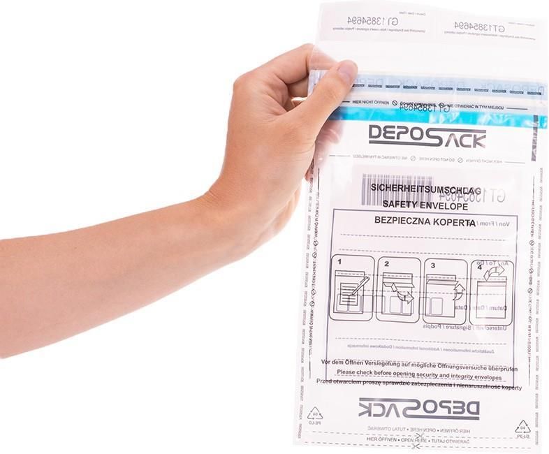 Koperta bezpieczna B5 Deposack Rozmiar 160x270mm Kolor: transparentny Koperta bezpieczna wykonane z trójwarstwowej folii polietylenowej Posiada 3 kupony umożliwia kontrolę poszczególnych etapów transportu Jednostka sprzedaży: 1 sztuka