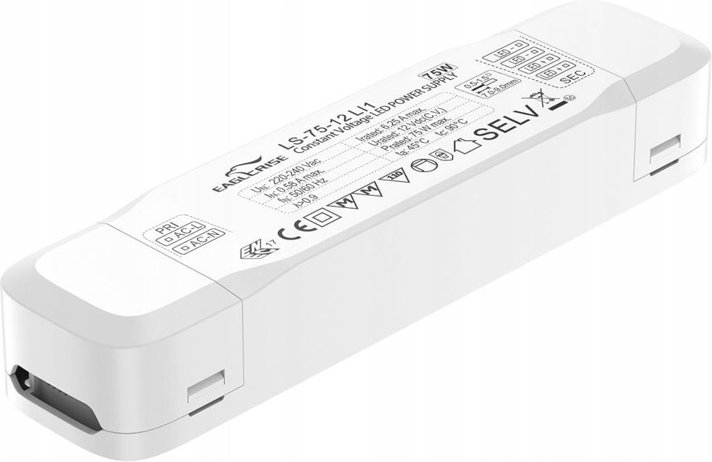 Stałonapieciowy zasilacz do LED, marki Eaglerise LS-75-12LI1 75W 12V DC napięcie wejścia : 176-264V AC napięcie wyjścia : 12V DC moc znamionowa : 75W natężenie wyjścia : 6,25A metoda chłodzenia : pasywna wymiary : 187X45X30.5 (L x W x H ) mm Cechy zasilacza Zasilacz stałonapięciowy Europejski zakres wartości napięcia wejściowego Zabezpieczenia: Przeciążeniowe / Zwarciowe / Termiczne Chłodzenie swobodnym obiegiem powietrza Zgodność z międzynarodowymi normami oświetleniowymi Producent gwarantuje pięcioletni bezproblemowy okres użytkowania.