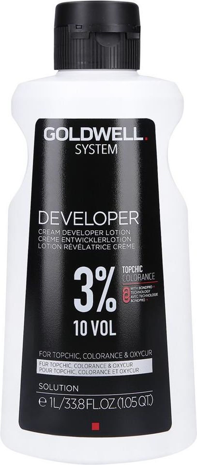 Goldwell System Developer 3% – aktywator do farb Topchic i rozjaśniaczy Oxycur Platin Pojemność (ml): 1000 Chcesz skutecznie i trwale zmienić kolor swoich włosów? Szukasz oksydantu, który stworzy idealny duet z farbami Topchic albo rozjaśniaczami Oxycur Platin? W takim razie koniecznie wybierz aktywator Goldwell System Developer w odpowiednim stężeniu i ciesz się intensywnym i trwałym kolorem swoich kosmyków. Goldwell System Developer to profesjonalny oksydant do włosów, który doskonale współpracuje z farbami Topchic i rozjaśniaczami Oxycure Platin. Wystarczy wymieszać je z odpowiednią dawką aktywatora i rozprowadzić na włosach, by uzyskać niesamowity efekt: głęboki, intensywny kolor i spektakularny połysk. W dodatku nakładanie mieszanki jest bardzo proste, gdyż łatwo rozprowadza się na włosach i ściśle do nich przylega. Oksydant w swoim składzie zawiera glicerynę i alaninę odpowiadające za zachowanie kosmyków w doskonalej kondycji. Jego udoskonalona receptura z innowacyjną technologią BondPro+ chroni włosy podczas zabiegu koloryzacji lub rozjaśniania. Formuła IntraLipid ułatwia rozczesywanie kosmyków i sprawia, że pasma stają się miękkie i przyjemne w dotyku. Oksydant występuje w różnych stężeniach i nadaje się do stosowania zarówno do użytku domowego, jak i w profesjonalnym salonie fryzjerskim. Zalety stosowania oksydantu Goldwell System Developer doskonale sprawdzi się w połączeniu z farbami Topchic i rozjaśniaczami Oxycur Platin; umożliwia perfekcyjną koloryzację i rozjaśnienie; gwarantuje trwałe efekty; zapewnia intensywny kolor i niesamowity połysk; chroni kosmyki w trakcie koloryzacji; bez problemu rozprowadza się na włosach; do pielęgnacji salonowej i domowej. Sposób użycia Stosuj zgodnie z instrukcją umieszczoną na opakowaniu. Skład Water/Aqua/Eau, Hydrogen Peroxide, Mineral Oil/Paraffinum Liquidum/Huile Minerale, Cetearyl Alcohol, Glycerin, Phosphoric Acid, Sodium Lauryl Sulfate, 2,6-Dicarboxypyridine, Etidronic Acid, Bis-Methoxypropylamido Isodocosane, Alanine, Glycine, Malic Acid, Salicylic Acid.