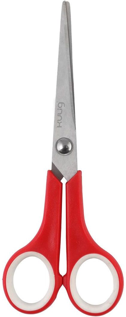 Nożyczki Kulig 7007 6,5" czerwone Praktyczne i uniwersalne nożyczki z miękkim uchwytem, których ostrza wykonane są z wysokiej jakości stali nierdzewnej, a rękojeści z tworzywa sztucznego. Dzięki miękkiemu wykończeniu wewnętrznej części uchwytu, używanie nożyczek jest wygodniejsze, a nacisk dłoni przy pracy bardziej zamortyzowany. Długość całkowita 17 cm, długość ostrza 10 cm.