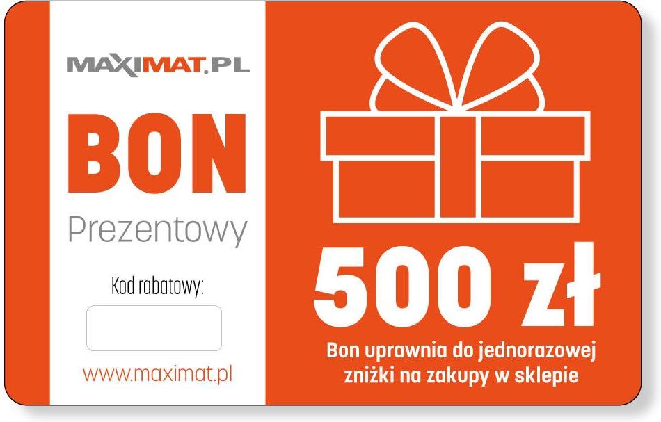 E-Bon prezentowy o wartości 500 zł na zakupy w sklepie maximat.pl Ważność: 12 miesięcy od daty opłacenia zamówienia Tę wersję otrzymasz fizycznie w formie wydrukowanej karty w etui i kopercie. Jeśli chcesz otrzymać mailem elektoniczną kartę upominkową o tej wartości możesz zamówić jąTUTAJ Zalety prezentu w postaci bonu podarunkowego: Bon daje obdarowanej osobie możliwość wyboru wzorów według własnego gustu i dopasowania ich do swoich oczekiwań. Jak działa bon? Na karcie wpisany jest unikalny kod rabatowy aktywowany w momencie zakupu i ważny 12 miesięcy. Ciąg cyfr należy wisać w pole kod rabatowy podczas składania zamówienia. Wartość zamówienia i przesyłki zostanie pomniejszona o wartość bonu. Bony prezentowe można łączyć z innymi kodami rabatowymi lub promocyjnymi jeśli akurat są aktywne. Bon uprawnia do jednorazowego zamówienia, dlatego warto wykorzystać go w całości Niewykorzystana kwota nie podlega zwrotowi, a karty nie doładowuje się. Wartość zakupów może być większa od kwoty przypisanej do Bonu pod warunkiem opłacenia różnicy przez użytkownika składającego zamówienie. Kod zostaje aktywowany dopiero w momencie zakupu i jest informacją poufną. Za jego bezpieczeństwo od momentu przekazania odpowiada Nabywca.