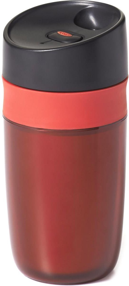 Kubek termiczny 295ml Good Grips – OXO – znakomity kubek zarówno do napojów zimnych, jak i gorących. Z zewnątrz pokryty jest warstwą z poliwęglanu, m.in. odporną na stłuczenia. Dzięki zastosowaniu w naczyniu podwójnej ścianki i trzech wbudowanych uszczelek z silikonu, utrzymuje doskonałe właściwości izolacyjne i szczelność. Dzięki temu na długo zachowuje temperaturę napoju i zapobiega jego wyciekaniu. Świetnie sprawdza się w domu, pracy, samochodzie, na spacerze czy uczelni. Kubek termiczny 295ml Good Grips – OXO posiada wiele zalet w tym: wyprofilowany ustnik, a przez to komfort picia otwarcie jedną ręką za pomocą kliknięcia przycisku wnętrze i wieczko wolne od BPA antypoślizgową wykonaną z silikonu opaskę rozmiar kubka idealny do większości uchwytów samochodowych szczelność – chroniąc przed rozlaniem zdolność długiego utrzymywania temperatury napoju ciekawy design Uwaga: Przed pierwszym użyciem Kubek termiczny 295ml Good Grips – OXO należy umyć w ciepłej wodzie, nie wypełniać ponad poziom oznaczony wewnątrz kubka "Max fill line". Nie nalewać napojów gazowanych. Myć tylko ręcznie. Przeznaczenie: do zimnych i gorących napojów Wymiary: 17 x 8 cm (wysokość x średnica) Pojemność: 295ml Materiał: Tworzywo sztuczne, silikon, poliwęglan Kolor: czerwono-czarny