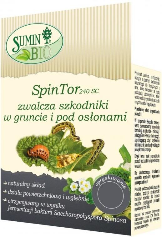 Spintor 240 SC – środek przeznaczony do stosowania przez użytkowników nieprofesjonalnych. Środek owadobójczy w formie koncentratu w postaci stężonej zawiesiny do sporządzania zawiesiny wodnej, o działaniu kontaktowym i żołądkowym oraz jajobójczym, przeznaczony do zwalczania niektórych szkodników gryzą-cych w uprawie ziemniaka, kapusty głowiastej białej, kalafiora, brokuła, cebuli, pora, truskawki, borówki wysokiej, agrestu, maliny, jeżyny, porzeczki czarnej, porzeczki czerwonej, porzeczki białej, żurawiny oraz w uprawianym pod osłonami pomidorze i ogórku. Na roślinie działa powierzchniowo i wgłębnie. Działanie wgłębne dotyczy wyłącznie młodych liści. Środek jest otrzymywany w wyniku fermentacji bakterii Saccharopolyspora spinosa. Substancja biologicznie czynna działa na komórki nerwowe owada, co prowadzi do paraliżu, a następnie do śmierci szkodników. Objawy działania środka występują w ciągu kilkunastu minut po zabiegu, śmierć szkodnika następuje po upływie kilku godzin. Środek przeznaczony do stosowania przy użyciu opryskiwaczy ręcznych. Zawartość substancji czynnej: spinosad: Spinozyn A, Spinozyn D (substancja z grupy makrocyklicznych laktonów) – 240 g/l (22,72%) Okres prewencji: Nie wchodzić do czasu całkowitego wyschnięcia cieczy użytkowej na powierzchni roślin.