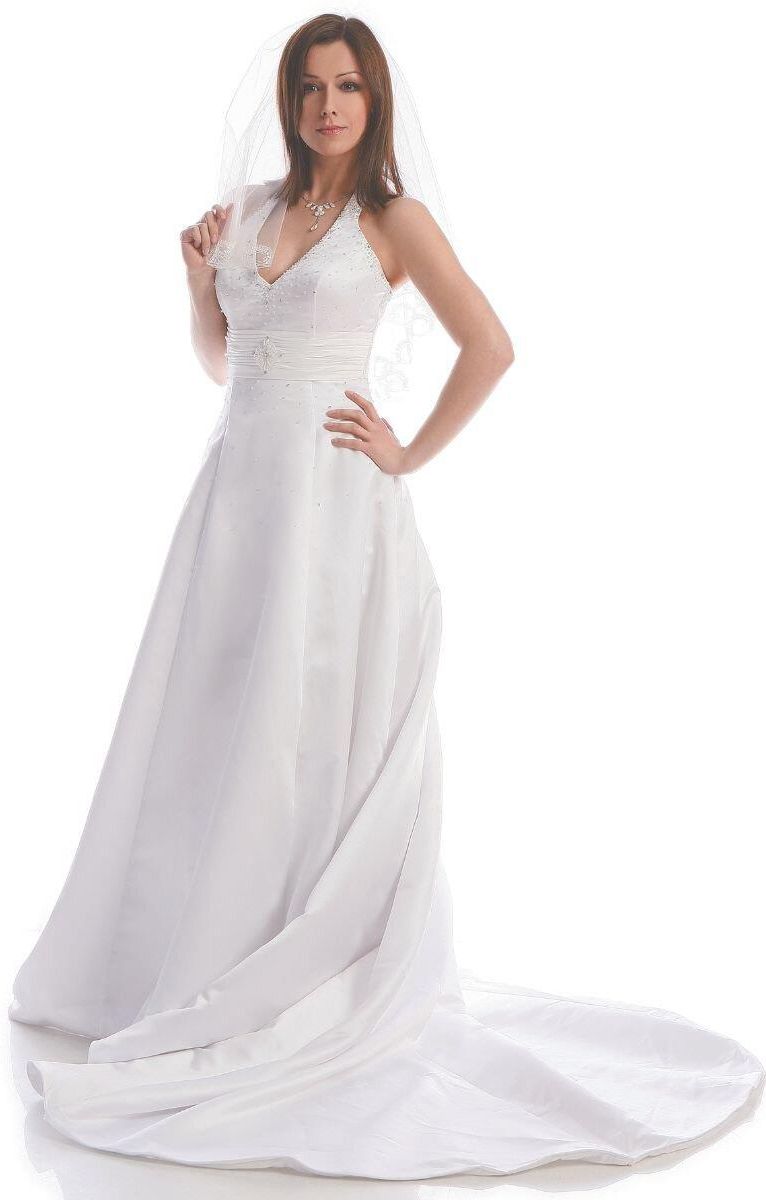 Rzeczywisty kolor sukni: biały Fason: litera A, tren Dekolt przód: serek Plecy: odkryte częściowo Zapięcie: suwak zwykły na plecach Ozdoby: koraliki, cekiny, cyrkonie, draperia Materiał: satyna, tiul
