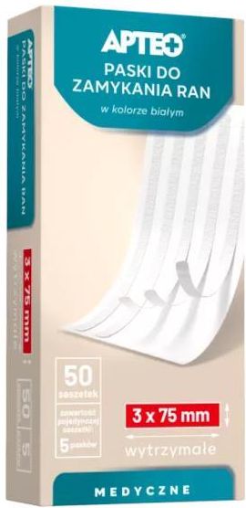 Opakowanie: 1 saszetka - 5 pasków Paski do zamykania ran zestaw w kolorze białym, nieinwazyjne zamykanie drobnych ran i cięć, sterylne, w kolorze skóry, wytrzymałe i elastyczne, łatwe w użyciu, dobrze przylegają do skóry, hipoalergiczny klej. Status Wyrób medyczny 1. Oczyścić ranę i skórę w pobliżu rany, pozostawić do całkowitego wyschnięcia. 2. Wyciągnąć paski z saszetki oraz odklejać pojedynczo z papieru ochronnego bezpośrednio przed użyciem. 3. Zbliżyć starannie do siebie oba brzegi rany i rozpoczynając od środka, umieścić pierwszy pasek prostopadle do rany. Unikać naprężania podczas przyklejania. 4. Przykleić kilka pasków około 2-3 mm od siebie. 5. Aby usunąć pasek, odklej ostrożnie oba końce w kierunku zranionego miejsca. Środki ostrożności: Zużyć natychmiast po otwarciu saszetki. Nie stosować na poważne, głębokie i rozległe rany. Opatrunek należy zmieniać co 24 godziny lub jeśli zamoknie. W przypadku nadmiernego krwawienia z rany, podrażnienia lub zakażenia skóry, należy usunąć pasek. Przed zastosowaniem u osób chorujących na cukrzycę należy skontaktować się z lekarzem. Uwagi Uwaga! W rzadkich przypadkach u dzieci może pojawić się wysypka spowodowana ciepłem i wilgocią, szczególnie na twarzy. W takim przypadku należy natychmiast skontaktować się z lekarzem. To jest wyrób medyczny. Stosuj go zgodnie z instrukcją użycia lub etykietą. Posiada oznakowanie CE Posiada deklarację zgodności UE. Zawiera instrukcję obsługi w języku polskim. Zawiera etykietę oraz oznaczenia w języku polskim. Dystrybutor: Synoptis Pharma Sp. z o.o. ul. Krakowiaków 65