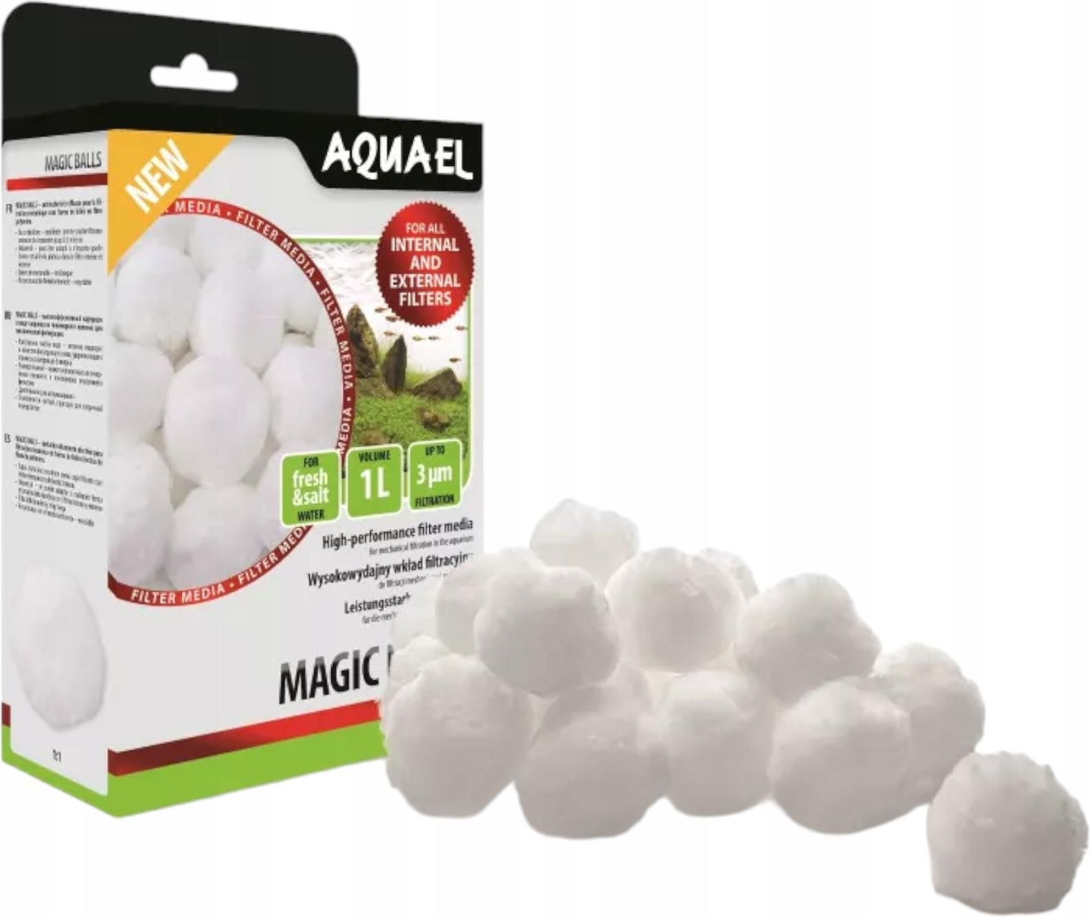 Magic Balls 1l Aquael producent: Aquael Opis MAGIC BALLS to skuteczny wkład do filtracji mechanicznej, w postaci kul wykonanych z włókna polimerowego zatrzymujący zanieczyszczenia o wielkości do 3 mikronów. Stanowi ostatni etap filtracji w akwarium, poprzez zatrzymanie zanieczyszczeń na swojej powierzchni. Idealnie działają jako ostatnia warstwa systemu filtracyjnego akwarium. Jak działa? To proste – poprzez zatrzymanie zanieczyszczeń na swojej powierzchni. Te polimerowe kulki przypominające waciki kosmetyczne są mistrzami w zbieraniu nawet najdrobniejszych zawiesin i drobinek, które mogą być widoczne w zbiorniku jako niechciana zawiesina. Działają jako ostatnia warstwa filtracyjna systemu filtracyjnego akwarium. Magic Balls uzupełniają filtrację usuwając wszystko, to co mogło ujść jej uwadze na wcześniejszych etapach. Dodatkowym atutem Magic Balls jest ich przyjazność dla środowiska, ponieważ są przeznaczone do recyklingu. Gdzie stosować? Magic Balls są niezwykle uniwersalne i można je stosować w dowolnym rodzaju filtrów, zarówno wewnętrznych, jak i zewnętrznych, bez względu na ich kształt i wielkość. To sprawia, że są one wyborem numer jeden dla każdego akwarysty, niezależnie od rodzaju zasobnika czy filtra. Jak długo działa? Magic Balls są niezwykle trwałe i mają długą żywotność, co oznacza, że nie musisz martwić się ich częstą wymianą. Zaleca się ją nie częściej niż raz na 3-6 miesięcy, co jest gwarancją nieustannej, wysokiej wydajności filtra. Kluczowe cechy Wychwytuje cząsteczki do 3 mikronów Idealne dopasowanie do zasobnika Przeznaczone do recyclingu Galeria produktu