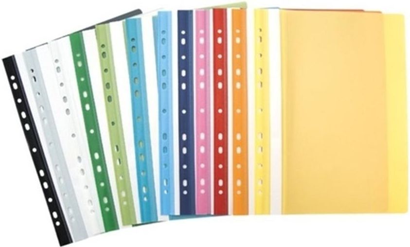 Skoroszyt wykonany z folii PP. Przezroczysta przednia okładka, kolorowa tylna. Standardowa perforacja na grzbiecie do wpięcia w segregator. Cechy produktu: - lekki i wygodny do przenoszenia - proste przechowywanie dokumentów - na grzbiecie wymienny papierowy pasek do opisu - zaokrąglone rogi obu okładek - metalowe wąsy - format: A4 - różne kolory - opakowanie: 20 sztuk