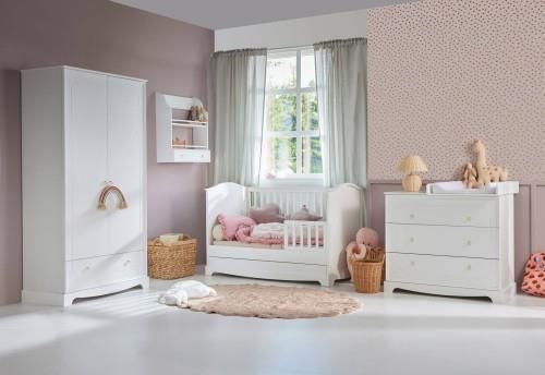 Kolekcja dla prawdziwej księżniczki lub prawdziwego księcia. Królują tu szlachetne wykończenia i stylowe zdobienia. To meble dla najbardziej wymagających gustów. W majestacie jej wysokości / meblowości! Zestaw zawiera: łóżeczko z funkcją tapczanika 140x70 - w zestawie szuflada (nie zawiera w zestawie barierek i materaca) komoda (nie zawiera w zestawie przewijaka) szafa Pozostałe meble z kolekcji: regał półka biurko łóżko 200x90 Cechy kolekcji: kolor biały (NCS S 0505-R70B) stylowe zdobienia mebli i uchwyty zaokrąglone bezpieczne krawędzie spełnia europejskie standardy i normy bezpieczeństwa Lakiery wykorzystane w procesie produkcyjnym są bezpieczne dla dzieci, certyfikowane zgodnie z normą EN71/3 prowadnice firmy Blum wyposażone w system spowalniający zamykanie szuflad Materiał: płyta MDF lakierowana, wysokiej jakości płyta laminowana odporna na uszkodzenia i wilgoć, łatwa do utrzymania w czystości, drewno bukowe lakierowane, sklejka bukowa, ŁÓŻECZKO: - do łóżeczka pasuje materac o wymiarach: 140cmx70 cm- okres użytkowania: do około 6 roku - 3 wyjmowane szczebelki w jednej z ramek łóżeczka umożliwiające swobodne wchodzenie i wychodzenie z łóżeczka,- trzy poziomy położenia stelaża pod materac dostosowane do rozwoju dziecka (58/45,5/28 cm od podłogi),- możliwość przebudowania na sofę poprzez demontaż jednej z ramek,- przygotowane do założenia barierek zabezpieczających dziecko przed wypadnięciem z łóżeczka podczas snu (opcja),- pojemna szuflada na kółeczkach zakończonych oponką, bezpiecznych dla podłogi,- spełnia europejskie standardy i normy bezpieczeństwa. SZAFA: - prawa strona szafy z 5cioma półkami w tym 3 z możliwością regulacji położenia,- lewa strona szafy z 2ma drążkami oraz półką z możliwością regulacji położenia,- pojemna szuflada,- możliwość zamontowania do ściany – zalecane,- spełnia europejskie standardy i normy bezpieczeństwa. KOMODA: - trzy pojemne szuflady,- przygotowana pod montaż przewijaka z kolekcji Royal,- możliwość zamontowania do ściany – zalecane,- spełnia europejskie standardy i normy bezpieczeństwa. Dodatkowe informacje:Meble dostarczane są w paczkach do samodzielnego zmontowania. W paczkach znajduje się szczegółowa instrukcja montażu wraz z wyposażeniem (śrubki etc.). GWARANCJA PRODUCENTA Producent gwarantuje naprawę lub wymianę sprzętu do 24 miesięcy od daty zakupu