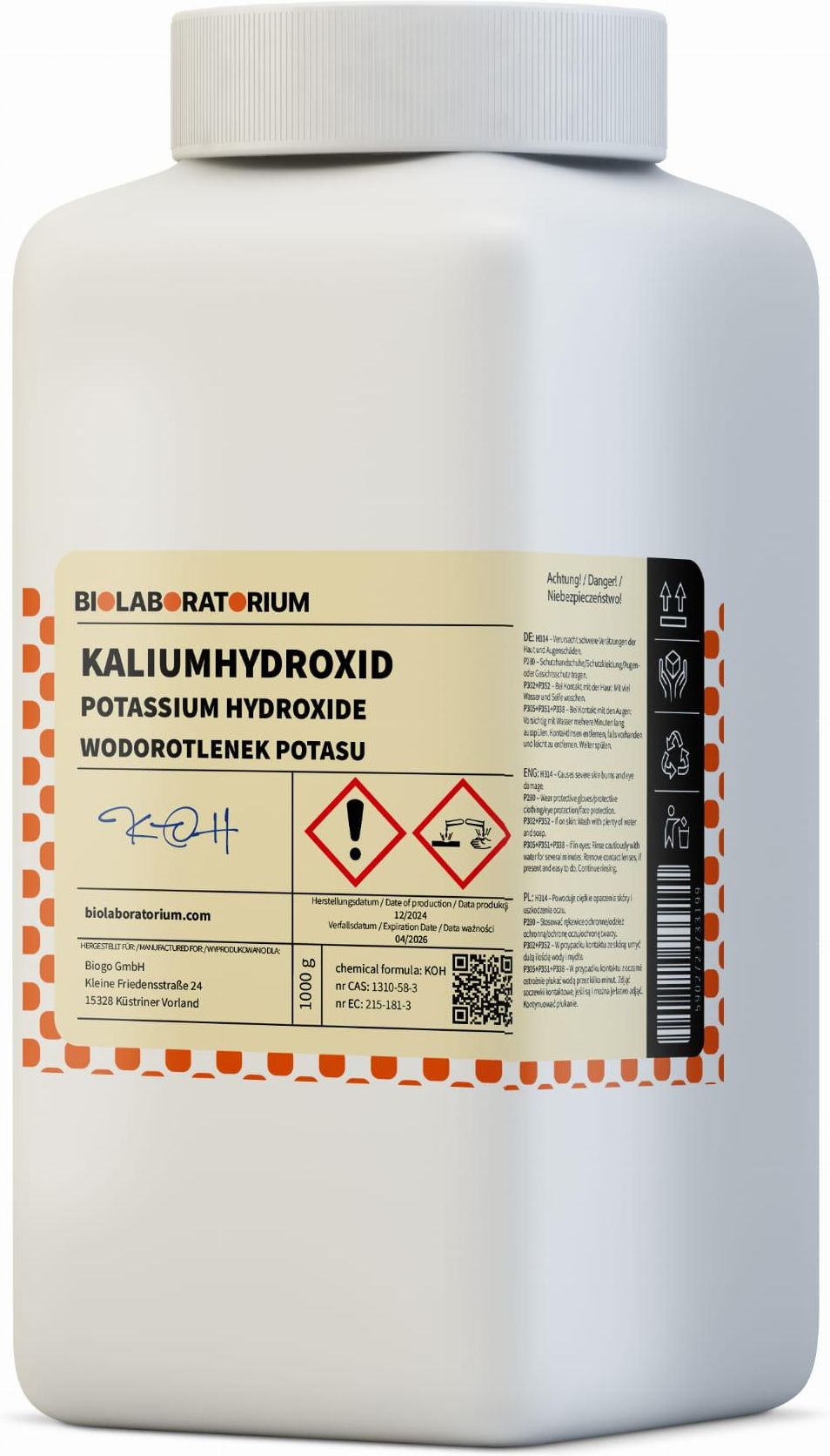 Wodorotlenek potasu 1000g BIOLABORATORIUM Wodorotlenek potasu 1kg BIOLABORATORIUM Informacje techniczne na temat odczynników chemicznych Wzór chemiczny: KOH Numer CAS: 1310-58-3 Numer WE: 215-181-3 Masa netto: 1000g Gatunek: czysty Czystość: co najmniej 90% Przykłady zastosowań profesjonalnych w różnych branżach Przemysł chemiczny - Produkcja związków potasu: Wodorotlenek potasu (KOH) jest stosowany jako materiał wyjściowy do produkcji różnych związków potasu, w tym węglanu potasu, nadmanganianu potasu i fosforanu potasu, które są wykorzystywane w różnych gałęziach przemysłu. procesów. Przemysł farmaceutyczny - Produkcja leków: Wodorotlenek potasu jest stosowany w przemyśle farmaceutycznym jako składnik w produkcji leków. Działa jako regulator pH i pomaga w produkcji niektórych preparatów farmaceutycznych. Rolnictwo - Produkcja nawozów: W rolnictwie wodorotlenek potasu jest wykorzystywany do produkcji nawozów bogatych w potas, które wspomagają wzrost roślin i poprawiają żyzność gleby. Przemysł spożywczy - Przetwórstwo żywności: Wodorotlenek potasu jest stosowany w przemyśle spożywczym jako dodatek do żywności (E525). Pełni funkcję regulatora pH i jest stosowany w przetwórstwie kakao, czekolady oraz jako środek obierania owoców i warzyw. Przemysł czyszczący - Produkcja środków czyszczących: Wodorotlenek potasu jest ważnym składnikiem w produkcji środków czyszczących i mydeł. Jego wysoka zasadowość pomaga zmydlać tłuszcze i oleje oraz usuwać uporczywe zabrudzenia. Branża akumulatorowa - Elektrolit w akumulatorach: Wodorotlenek potasu jest stosowany jako elektrolit w akumulatorach alkalicznych. Zapewnia wysoką przewodność i przyczynia się do wydajności oraz żywotności baterii. Ostrzeżenia na etykiecie produktu H302: Działa szkodliwie po połknięciu. H312: Działa szkodliwie w kontakcie ze skórą. < span>H314: Powoduje poważne oparzenia skóry oraz uszkodzenia oczu. H318: Powoduje poważne uszkodzenie oczu.< br> P280: Stosować rękawice ochronne/odzież ochronną/ochronę oczu/ochronę twarzy. P305+P351+P338: W PRZYPADKU DOSTANIA SIĘ DO OCZU: Delikatnie płukać wodą przez kilka minut. Jeżeli to możliwe, wyjmij soczewki kontaktowe. Kontynuuj płukanie. P310: Natychmiast skontaktować się z OŚRODKIEM ZATRUĆ lub lekarzem. Zalecane warunki przechowywania Zalecane warunki przechowywania wodorotlenku potasu (nr CAS: 1310-58-3) obejmują przechowywanie w szczelnie zamkniętym pojemniku, z dala od źródeł ciepła i światła. Produkt należy przechowywać w suchym i chłodnym miejscu, z dala od substancji łatwopalnych i materiałów organicznych. Należy unikać także kontaktu z wodą i substancjami kwaśnymi. Substancje chemiczne należy przechowywać w miejscu niedostępnym dla dzieci i zwierząt, w miejscu niedostępnym dla osób nieupoważnionych. Oznaczenia na opakowaniu Producent: Kategoria: Waga z opakowaniem: 0 kg