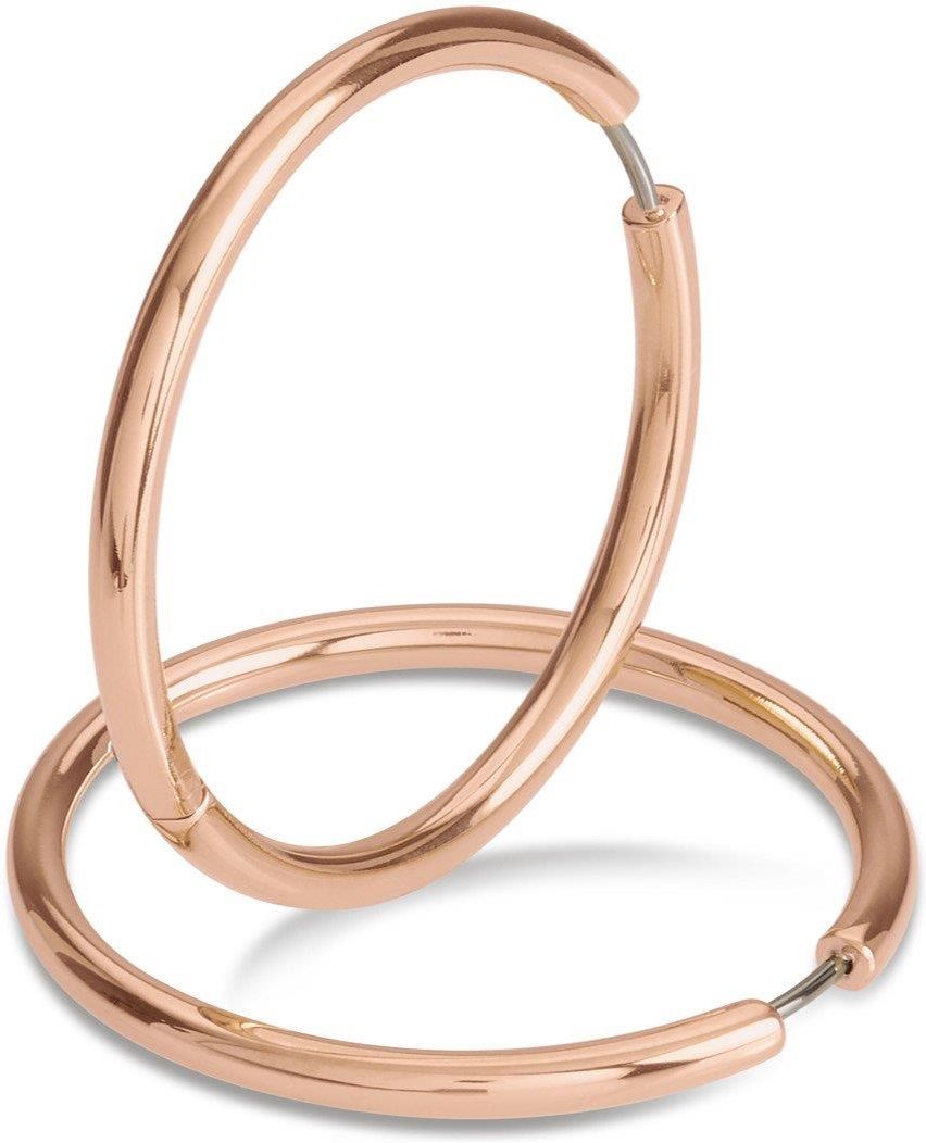 eleganckie kolczyki kółka dla kobiet wykonane z polerowanego czystego tytanu, powlekane jonami różowego złota, przyjazne dla skóry i hipoalergiczne, grawerowane laserowo logo, grubość 3 mm, średnica zewnętrzna 38 mm