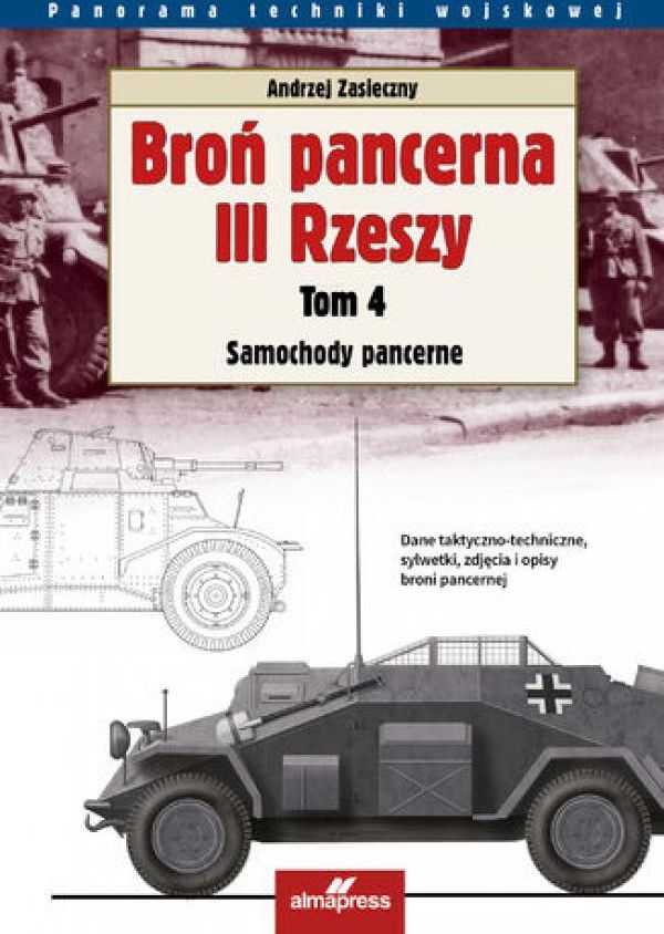 Książka zawiera opisy 20 typów i wersji samochodów pancernych III Rzeszy używanych podczas II wojny światowej. Przedstawiono historię rozwoju pojazdów, wszystkie wersje i odmiany, a także zastosowanie bojowe. Obszernie opisano budowę wozów, akcentując nowatorskie rozwiązania techniczne. Opis każdego pojazdu ilustrowany jest barwną sylwetką boczną, jednym lub kilkoma rysunkami w czterech rzutach oraz zdjęciami. We wstępie Autor wyjaśnia, czym różniły się kolejne generacje niemieckich samochodów pancernych. Książka jest czwartym tomem cyklu leksykonów o broni pancernej III Rzeszy. Spis treści: Okładka Strona tytułowa Strona redakcyjna Spis treści Od Autora Lekkie samochody pancerne Sd.Kfz. 13 i Sd.Kfz. 14 Lekkie samochody pancerne Sd.Kfz. 221, Sd.Kfz. 222 i Sd.Kfz. 223 Samochody pancerne Sd.Kfz. 260 i Sd.Kfz. 261 Samochód pancerny Sd.Kfz. 247 Samochody pancerne Sd.Kfz. 231/232 (Fu)/263 (Fu) 6-Rad Samochody pancerne Sd.Kfz. 231/232 (Fu)/263 (Fu) (8-Rad) Samochód pancerny Sd.Kfz. 234/1 Samochód pancerny ADGZ Samochód pancerny Panhard 178 P 204(f) Samochody pancerne AB 41 201(i)/AB 43 203(i)
