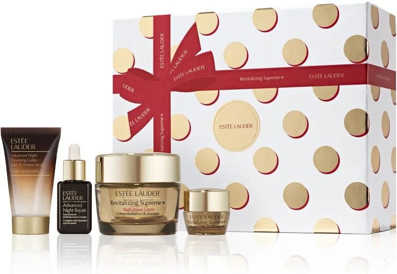 Nadaj swojej cerze nowy blask dzięki formułom, które w widoczny sposób poprawiają jędrność, gęstość i elastyczność skóry - zapewniając jej uniesiony, bardziej wyrazisty wygląd. Drobne linie i zmarszczki ulegają spłyceniu. Skóra wygląda na wzmocnioną, promienną i głęboko nawilżoną - z nową, zdrową witalnością. Zaawansowany żel oczyszczający na noc (Advanced Night Cleansing Gelée) delikatnie, ale dokładnie usuwa makijaż i zanieczyszczenia ze skóry, nie naruszając i nie wysuszając jej bariery nawilżającej. Skóra jest miękka, zrównoważona i przyjemna w dotyku. Rewitalizujący balsam pod oczy Supreme+ wyraźnie redukuje zmarszczki i cienie pod oczami. Okolice oczu wyglądają bardziej promiennie i młodzieńczo. Zaawansowane serum naprawcze na noc sprawia, że skóra staje się gładsza, bardziej jednolita i młodzieńcza - wyraźnie świeższa i zdrowsza. Rewitalizujący krem Supreme+ znacząco poprawia jędrność i elastyczność skóry, zapewniając jej wzmocnienie i widoczną jędrność. RAZEM KSZTAŁTUJEMY PRZYSZŁOŚĆ PIĘKNA. Prosimy o recykling papierowej tacki. Pudełko upominkowe jest idealne jako element dekoracyjny do przechowywania lub może być poddane recyklingowi w odpowiedzialny sposób. Limitowana kolekcja w ekskluzywnym pudełku upominkowym - zawiera te niezbędne produkty: - Rewitalizujący krem Supreme+ Siła Młodości, rozmiar oryginalny (50 ml) - Zaawansowany żel oczyszczający na noc z 15 aminokwasami, luksusowy rozmiar podróżny (30 ml) - Advanced Night Repair Synchronised Multi-Recovery Complex, luksusowy rozmiar podróżny (15 ml) - Rewitalizujący balsam pod oczy Supreme+ Youth Power, luksusowy rozmiar podróżny (5 ml)