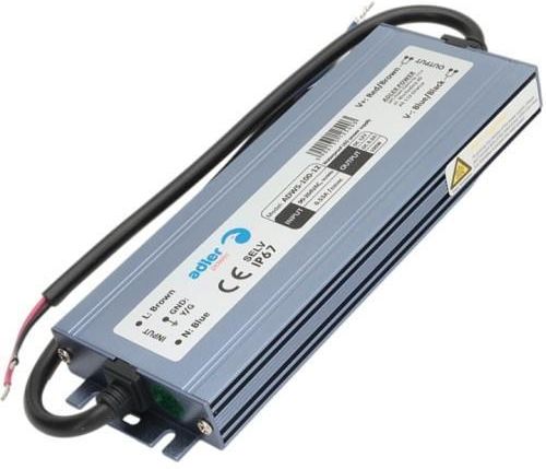 Wodoodporny ultrapłaski zasilacz do LED na 12V o mocy 100 Watt. Wysokiej jakości hermetyczny zasilacz Led w wodoodpornej płaskiej obudowie, na napięcie DC 12V o mocy 100 Watt. Transformator Led serii ADWS do taśm LED, do żarówek i modułów Led na DC12V. Zasilacz Led serii ADWS, jest wodoodpornym zasilaczem serii Ultra Flat Premium o wysokiej klasie szczelności IP67, do montażu w miejscach o dużej wilgotności jak łazienka, kuchnia, kotłownia, garaż lub na zewnątrz. Zasilacz z wodoodporną metalową szczelną obudową, która chroni zasilacz przed wilgocią i przypadkowymi kroplami wody. Zasilacz ADWS Adler Power w obudowie hermetycznej sprawdzi się w najbardziej wymagających instalacjach oświetleniowych Led. Przez długi okres użytkowania zachowuje swoje parametry oraz wydłuża żywotność instalacji oświetleniowej Led. Zasilacz dzięki szczelnej obudowie IP67, charakteryzuje się cichą pracą, dzięki czemu przy współpracy ze ściemniaczami Led PWM nie wydaje dźwięków przy ściemnianiu (cewka i kondensatory nie wpadają w drgania). Podstawowe zalety zasilacza serii ADWS: wodoodporna hermetyczna obudowa IP67, trwała metalowa obudowa odporna na uszkodzenia mechaniczne, wysoka jakość stabilizacji napięcia stałego DC 12V, wysoka niezawodność oraz wysoka sprawność użytkowa zasilacza Led, cicha praca zasilacza przy współpracy ze ściemniaczami Led PWM, Podstawowe zastosowanie zasilacza ADWS: do zasilania oświetlenia Led w łazience, do oświetlania ledowego na zewnątrz, zasilanie pasków led w listwie oświetleniowej, zasilanie taśm Led w szafach i meblach, do zasilania ledów w pomieszczeniach o dużej wilgotności, Podstawowe parametry zasilacza ADWS: napięcie znamionowe na wyjściu: DC12V, moc znamionowa: 100 Watt, znamionowe obciążenie prądowe: 8.3A, sprawność zasilacza: ⩾88%, maksymalne bezpieczne obciążenie dla zasilacza: 80 Watt, napięcie zasilania na wejściu: AC 170V-264V, częstotliwość napięcia zasilania: 47Hz-63Hz, zabezpieczenie przeciążeniowe: tak, zabezpieczenie zwarciowe: tak, zabezpieczenie termiczne: tak, klasa ochronności: II, klasa szczelności: IP67, chłodzenie zasilacza: pasywne, obudowa zasilacza: hermetyczna metalowa, długość przewodów przyłączeniowych: 200 mm wymiary zewnętrzne zasilacza (dł. x szer. x wys.): 182mm x 62mm x 19mm.
