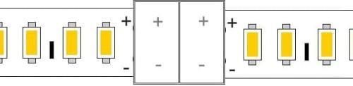 Złączka dwustronna do taśmy LED na diodach SMD z podkładem PCB 10mm. Model T-T 10mm to dwustronna złączka do połączenia ze sobą dwóch docinków taśmy Led w jeden odcinek. Używając złączki Led T-T można połączyć ze sobą dwa odcinki taśmy Led w jedną długość odcinka. Złączka służy do zapinania na taśmach Led dwupinowych o szerokości podkładu PCB 10mm z rozstawem pinów około 5mm. Zamiast stosowania złączek ze względu na lepszą trwałość połączeń, oraz lepsze i stabilne przejście napięcia zalecamy lutowania bezpośrednio przewodów do taśmy, lub łączenia ze sobą odcinków za pomocą bezpośrednich lutowań. Szerokość złączki musi odpowiadać szerokości podkładu PCB wybranej taśmy LED. Uwaga złączka nie pasuje rozstawem pinów do taśm LED COB.